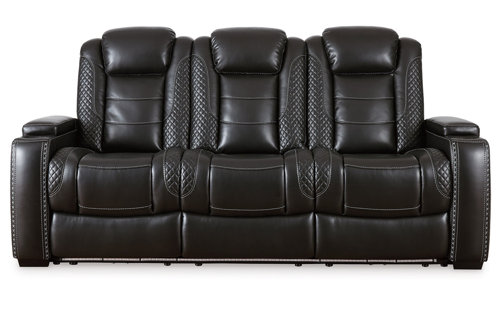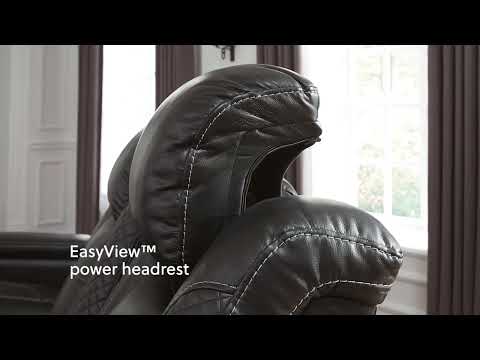 This power reclining sofa takes its cue from luxury automobiles with lattice- and cross-hatch stitching, for a richly tailored aesthetic that gives you plenty of reasons to celebrate. Sumptuously padded cushions and dramatic midnight black faux leather upholstery add to the indulgence. When it’s time to rev up the action, the sofa’s dual reclining bucket seats (middle seat is stationary), Easy View™ power adjustable headrests and center seat that folds down into a table keep you in the driver’s seat.