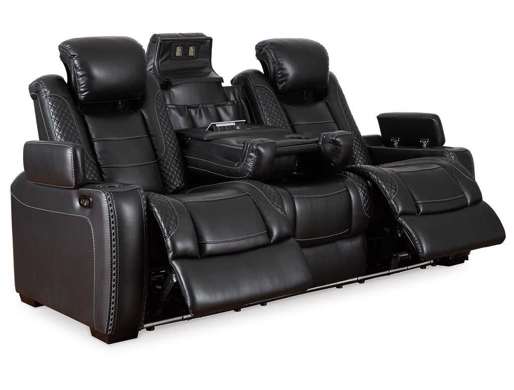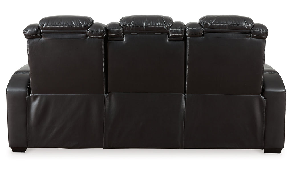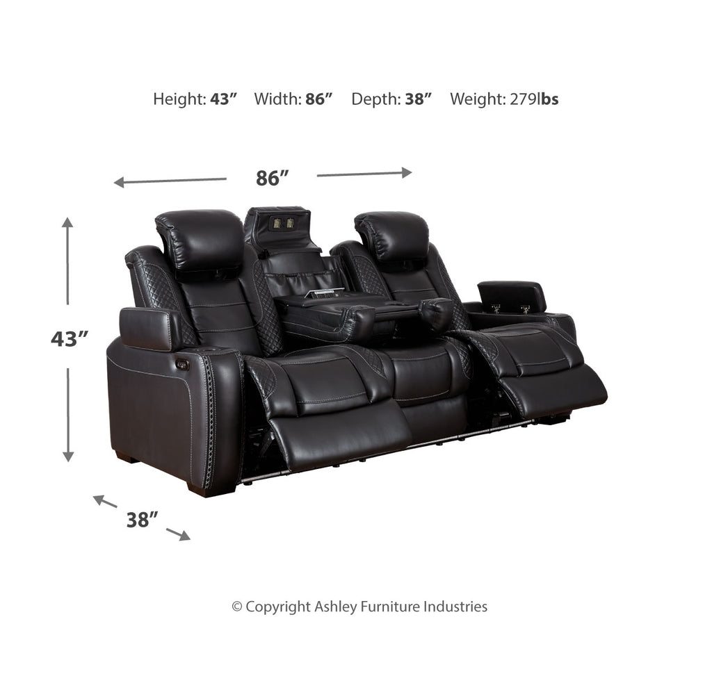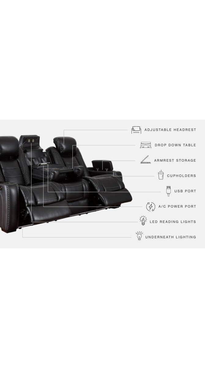 This power reclining sofa takes its cue from luxury automobiles with lattice- and cross-hatch stitching, for a richly tailored aesthetic that gives you plenty of reasons to celebrate. Sumptuously padded cushions and dramatic midnight black faux leather upholstery add to the indulgence. When it’s time to rev up the action, the sofa’s dual reclining bucket seats (middle seat is stationary), Easy View™ power adjustable headrests and center seat that folds down into a table keep you in the driver’s seat. | Product Features