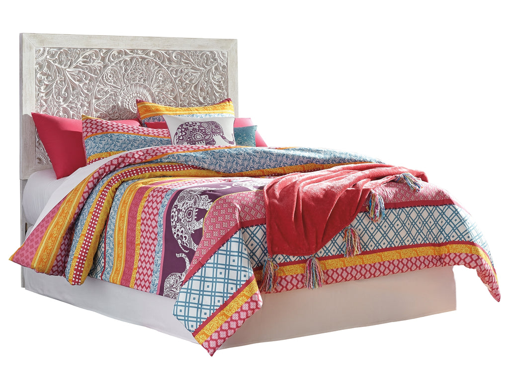 Your young trendsetter can live out her free spirit with this full headboard. Exquisite carved medallion pattern is a testament to boho-chic style. Charming whitewashed finish sets a foundation for a room bursting with personality. Adjustable height design offers added flexibility.