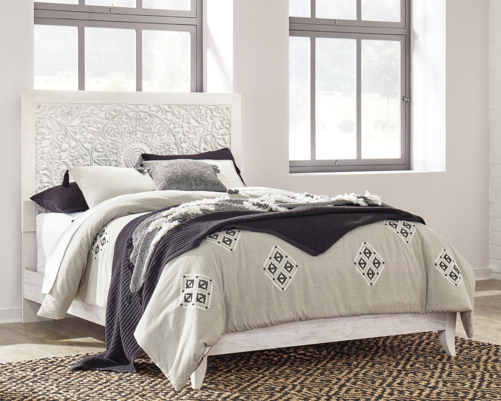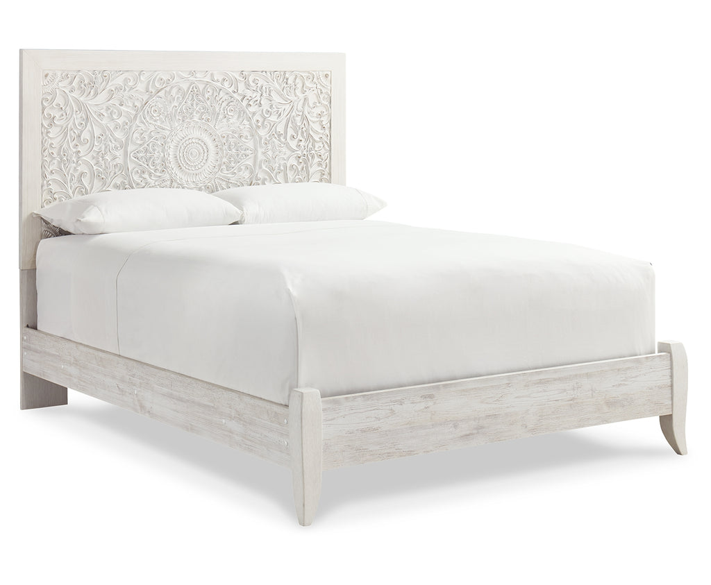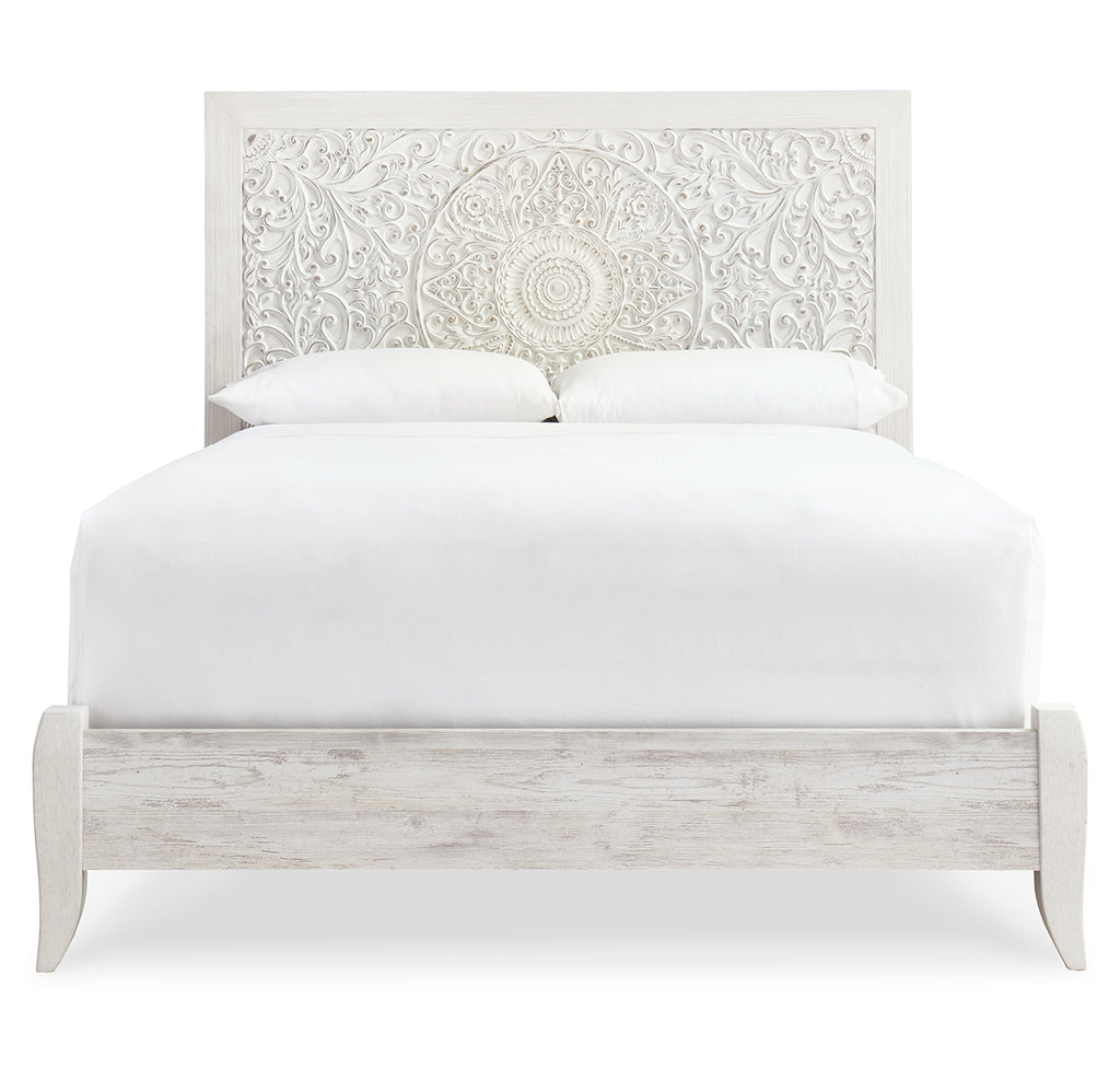 Your young trendsetter can live out her free spirit with this uniquely chic queen bed. Exquisite carved medallion pattern is a testament to true style. Charming whitewashed finish sets a foundation for a room bursting with personality. Headboard legs have four height options to grow with your child. |