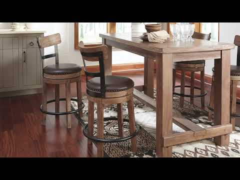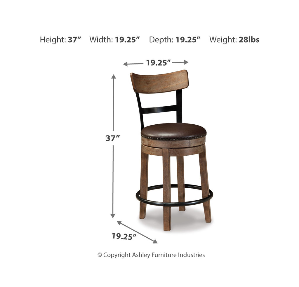 This striking counter height bar stool serves a sense of refinement without all the formality. A 360-degree spin element keeps you in the flow of conversation, while faux leather upholstered seating incorporates comfort and easy cleanup. The frame’s signature finish with a wire-brushed effect and gray undertones exudes an easy, relaxed sensibility. | Product Features