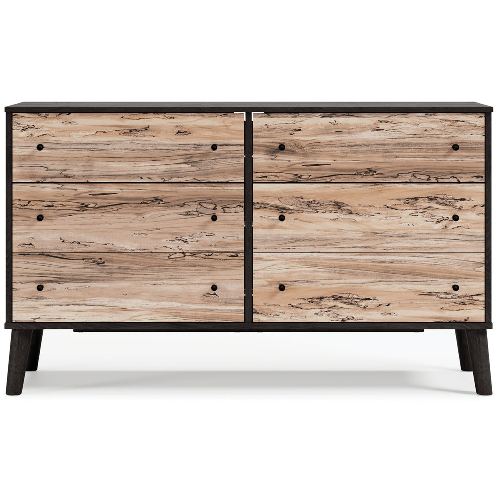The perfect marriage of simple and contemporary style, this dresser is a charming addition to your home. It features an expressive two-tone look, with a dark charcoal finish over replicated oak grain with an authentic touch and a replicated sugarberry wood grain. Ball-bearing glides offer smooth opening and closing of the drawers, while matte black knobs and splay legs add a finishing touch. | Product Features