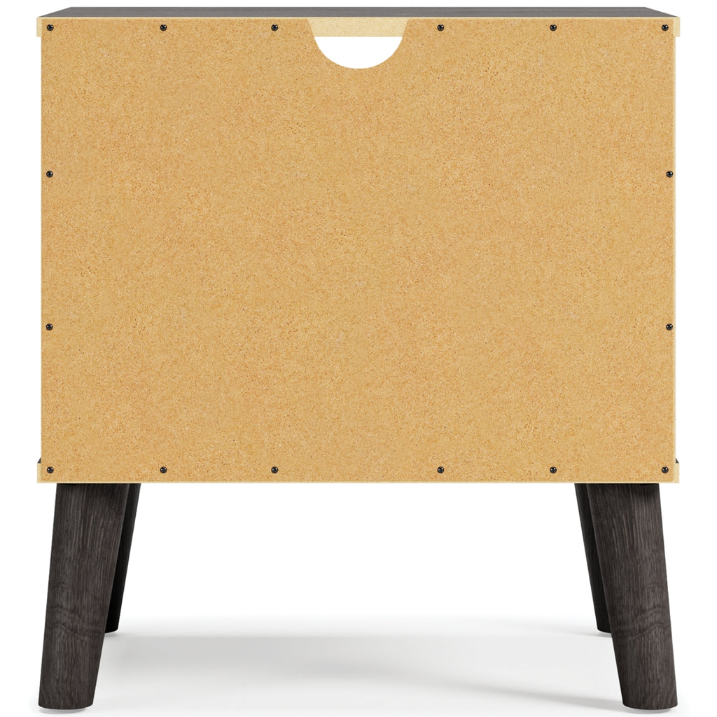 The perfect marriage of contemporary and casual style, this nightstand is a charming addition to your home. It features an expressive two-toned look, with a dark charcoal finish over replicated oak grain with an authentic touch and a replicated sugarberry wood grain. Matte black knobs and splay legs add a finishing touch, while the open shelving allows for extra storage. | Product Features