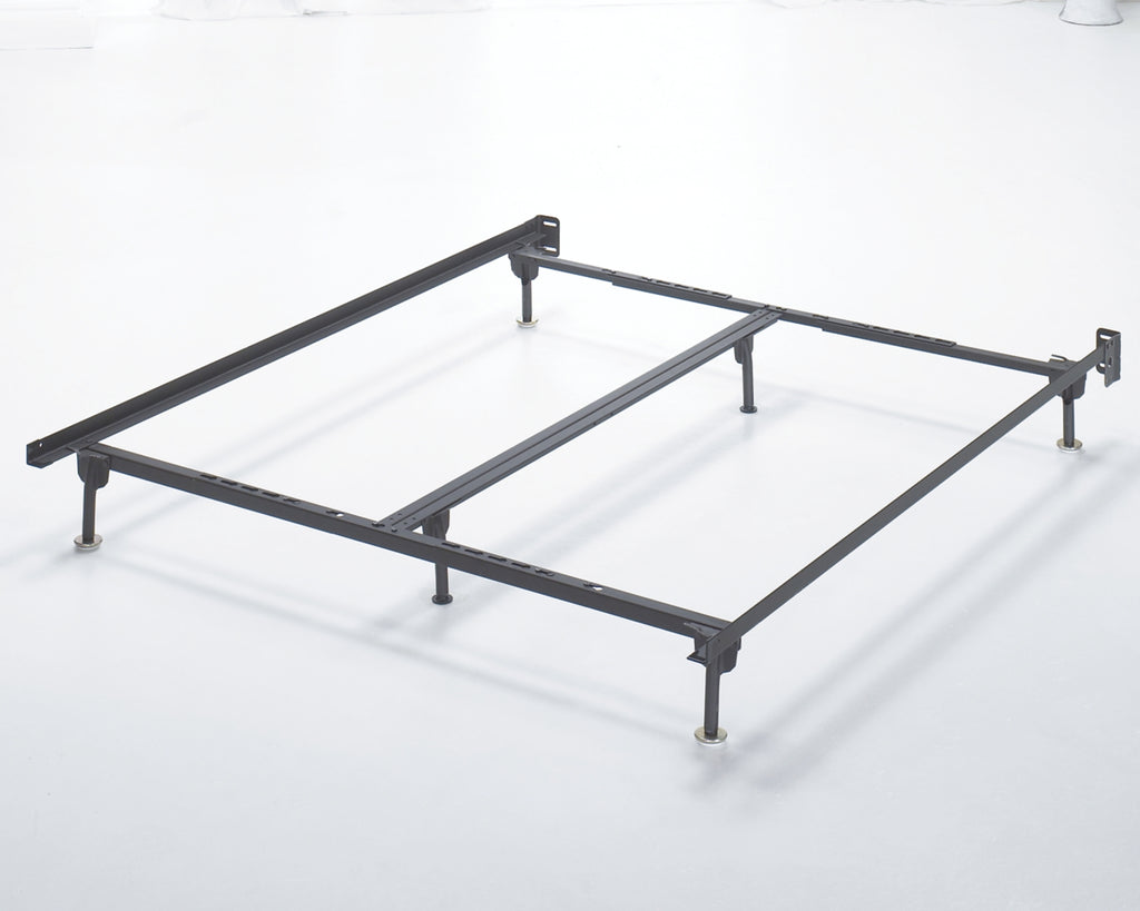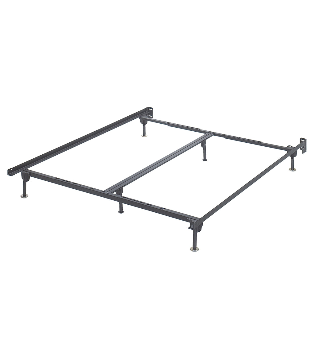 This sturdy metal bed frame supports queen/king/California king mattresses and box springs. Bolts connect the frame to most queen/king/California king headboards.