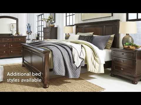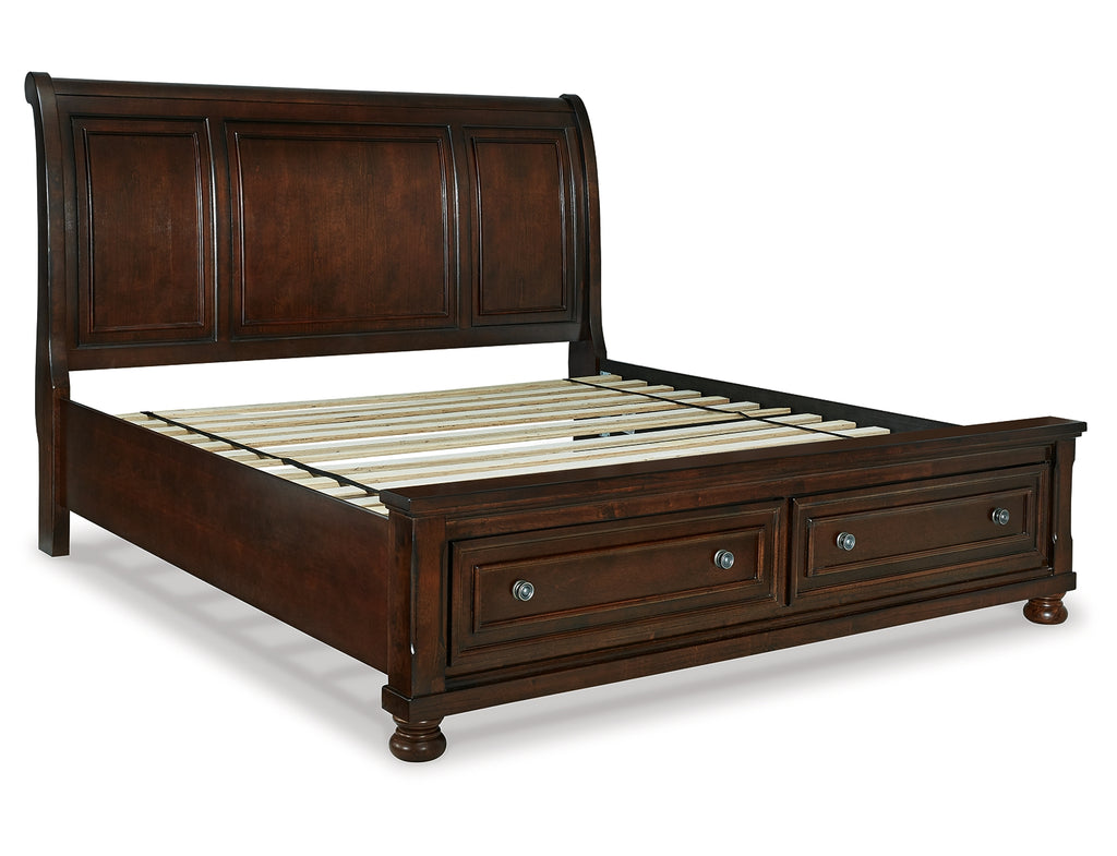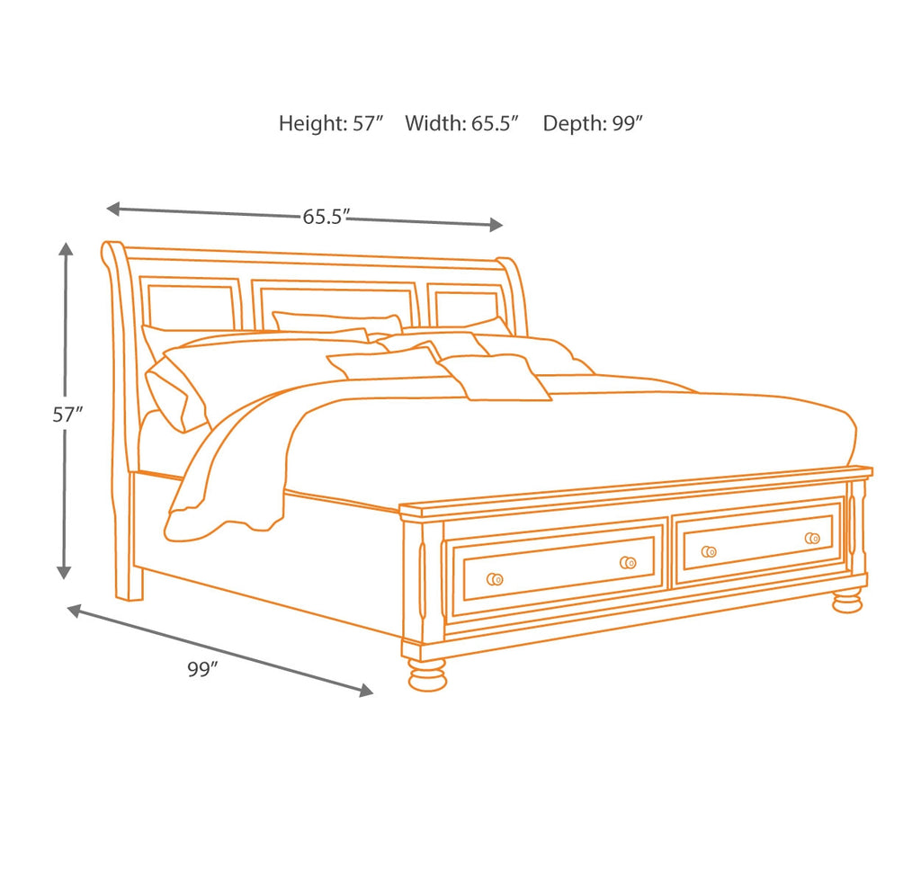 Those drawn to the warm, rustic feel of vintage-inspired interiors love how this California king sleigh storage bed suits their style. Its rustic finish is rich with character, while the beveled panel framing and turned bun feet reflect beauty in the details. Two storage drawers at the foot of the bed are the perfect place for throws and linens. Mattress and foundation/box spring sold separately. | Product Features