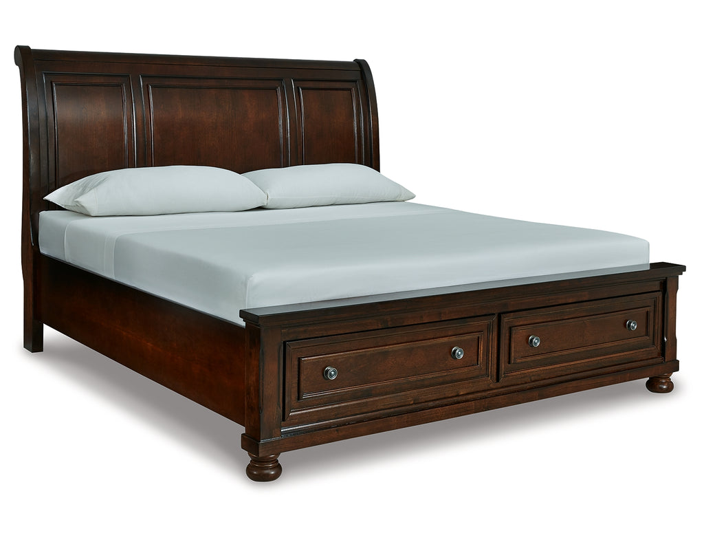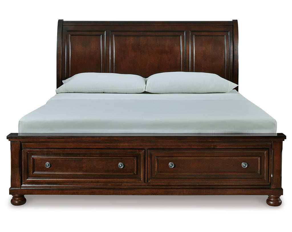 The quality craftsmanship is clear to see. The classic design elements—including bun feet—are easy to love. Satisfying your taste for vintage inspiration, this king sleigh storage bed is elegant without looking fussy. Two built-in drawers at the foot of the bed are great for storing linens and throws. Mattress sold separately. | Product Features
