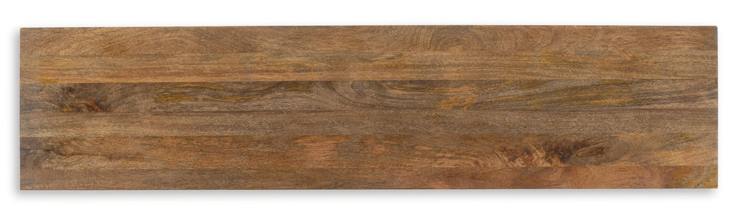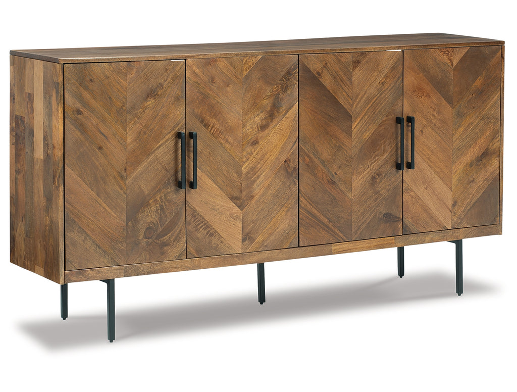 Storage options abound with this accent cabinet featuring 4 chevron pattern doors accented by long dark gray finished metal door pulls. Store dinnerware, cookbooks and many other options within the sideboard which features 2 fixed shelves. The light brown finish will complement virtually any room decor.