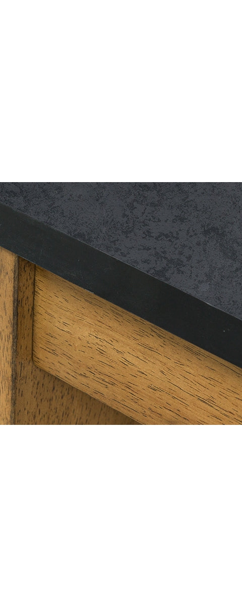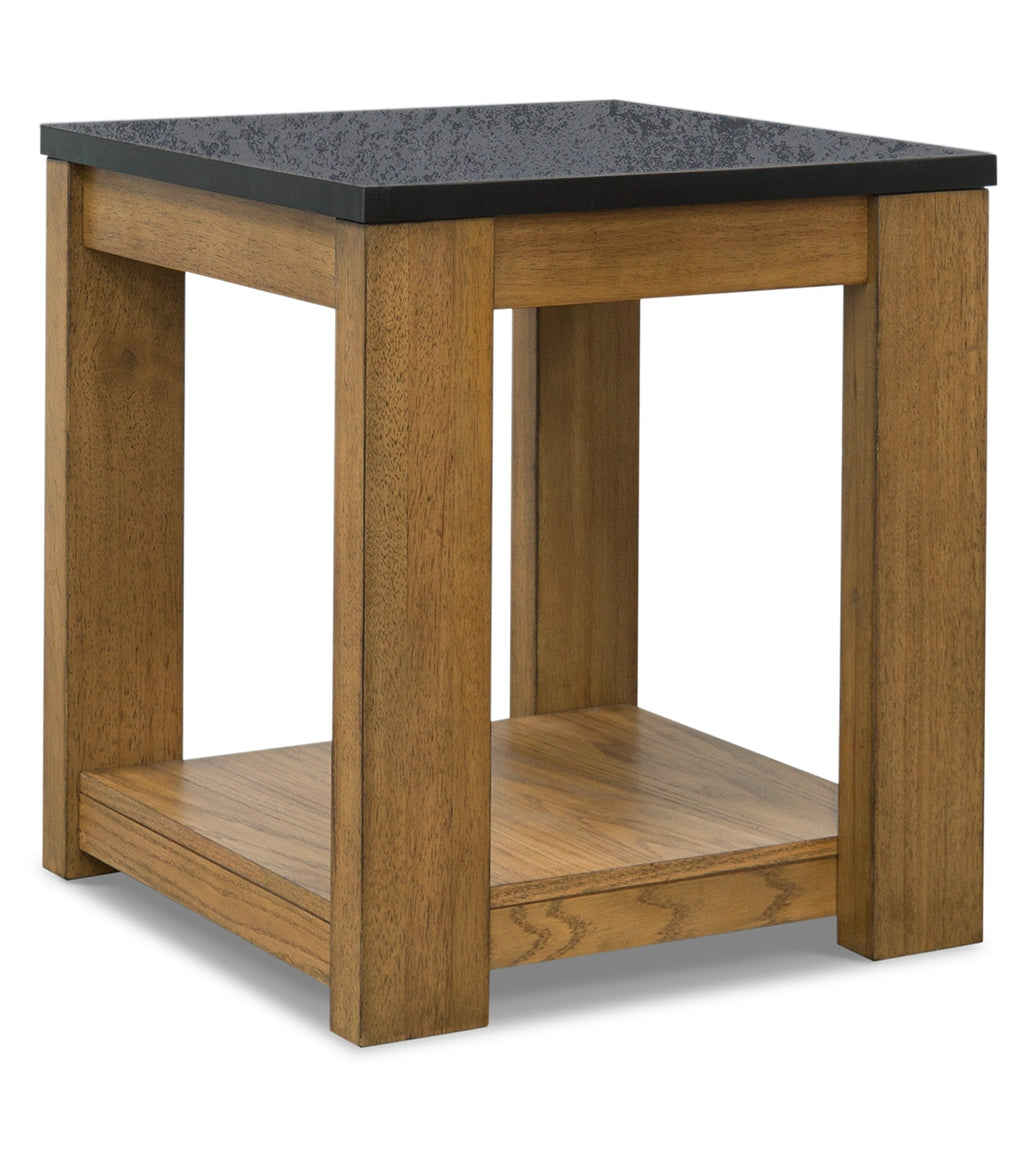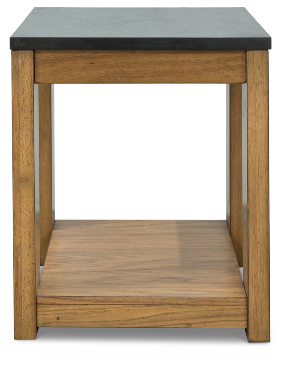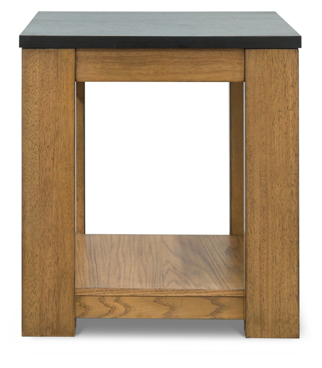 This rectangular end table simplifies any occasion in fine style. Clean lines and natural wood-tone legs make it endlessly versatile. The table's faux stone melamine laminate top is durable and waterproof—a clever blend of form and function.