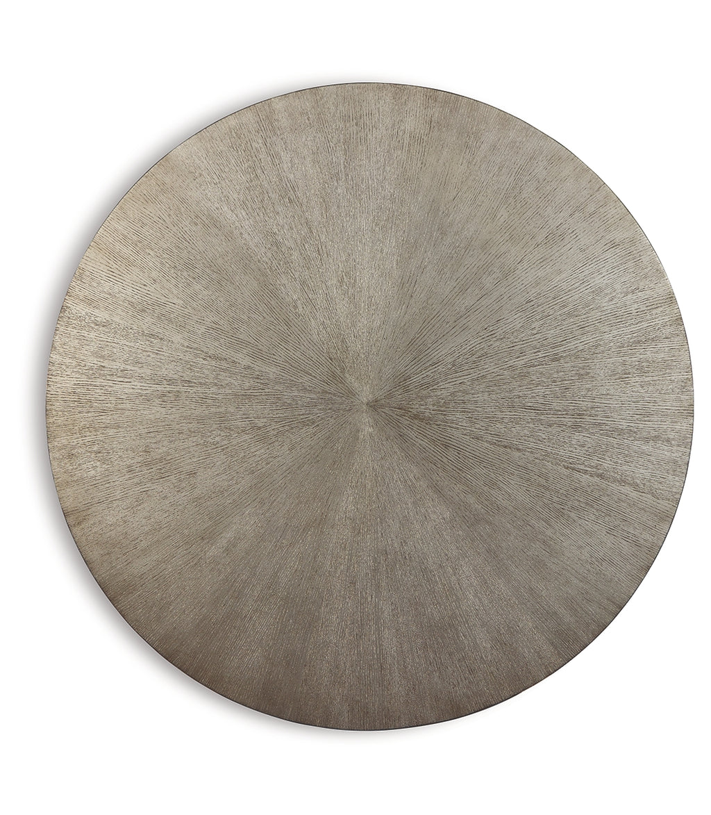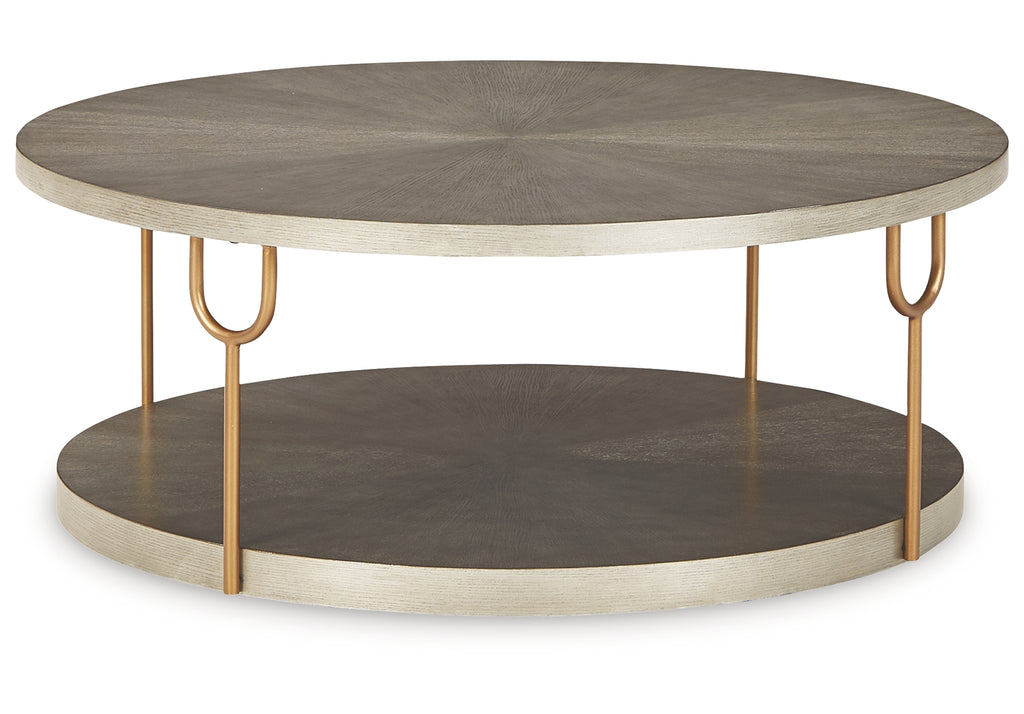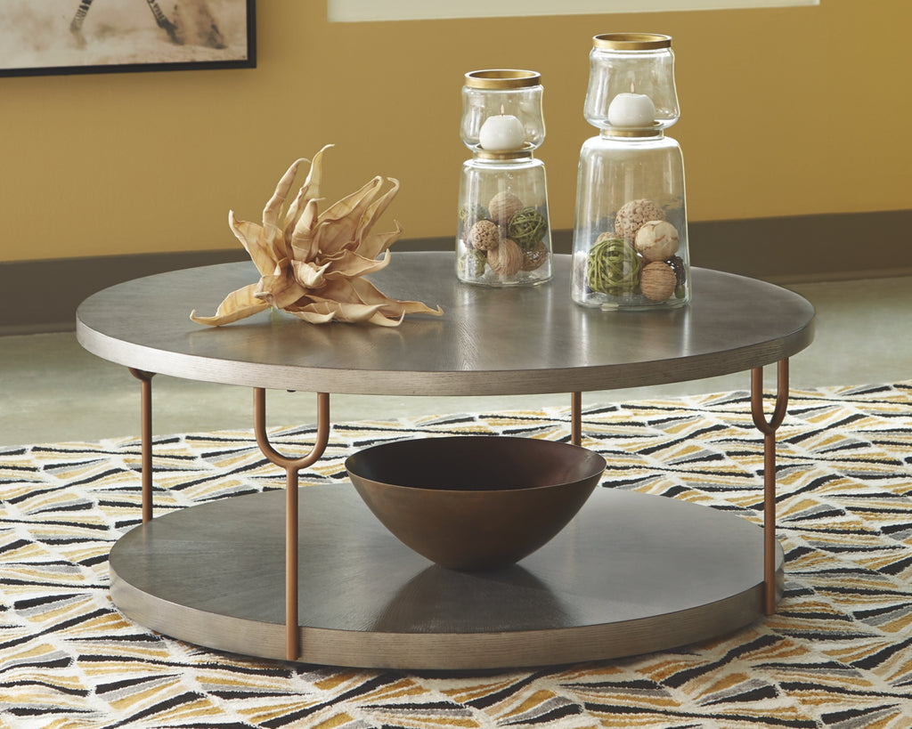 With the addition of a striking accent piece, one can take any room from ordinary to extraordinary. And this round coffee table has just what it takes to elevate your home's decor to astonishing new heights. Made with wood veneer in a warm metallic silvertone finish and complemented by metal tubular legs, its artful composition and spartan design mesh seamlessly into any modern living space. | Product Features