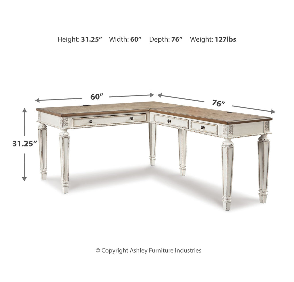 Elevating the art of traditional cottage styling, this L-shaped desk is your heavenly home office realized. Two-tone finish combines chipped white with distressed wood tone tops for added charm. Framed drawer fronts, decorative corbels and elegantly turned and tapered legs add refinement, while dark bronze-tone knobs lend a classic touch.