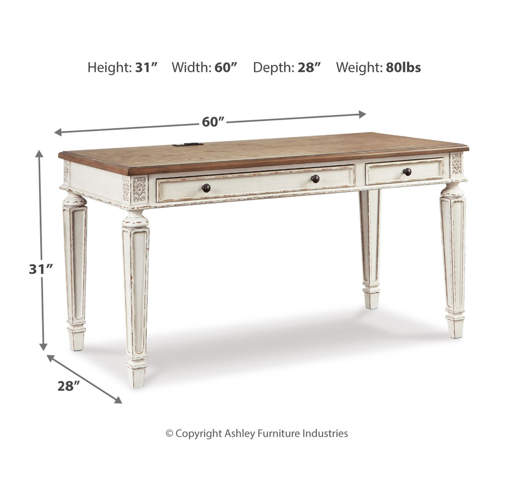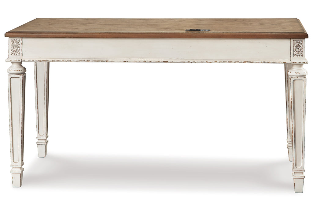 Elevating the art of traditional cottage styling, this designer desk is your heavenly home office realized. Antiqued two-tone aesthetic blends a chipped white with a distressed wood tone top for added charm. Framed drawer fronts, decorative corbels and elegantly turned and tapered legs add refinement, while dark bronze-tone knobs lend a classic touch. | Product Features