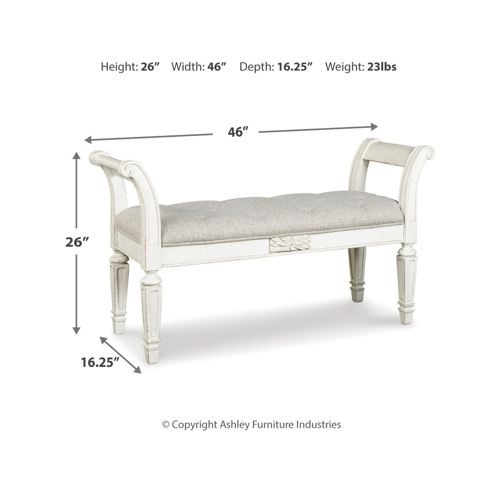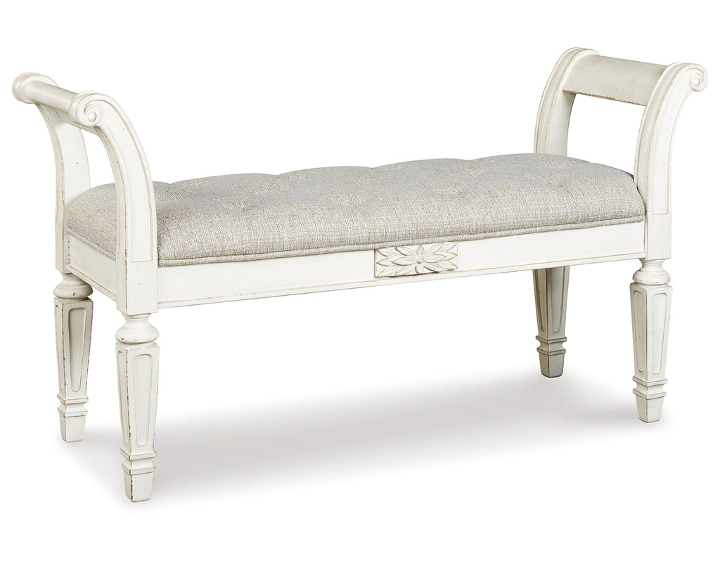A classic to be cherished for years. This accent bench is a timeless treasure. Quality wood frame flaunts an antiqued white finish. Touches like the scrolled arms and floral applique give this piece so much character. You’ll love sitting on the cushiony, tufted seat in all of its sophistication. | Product Features