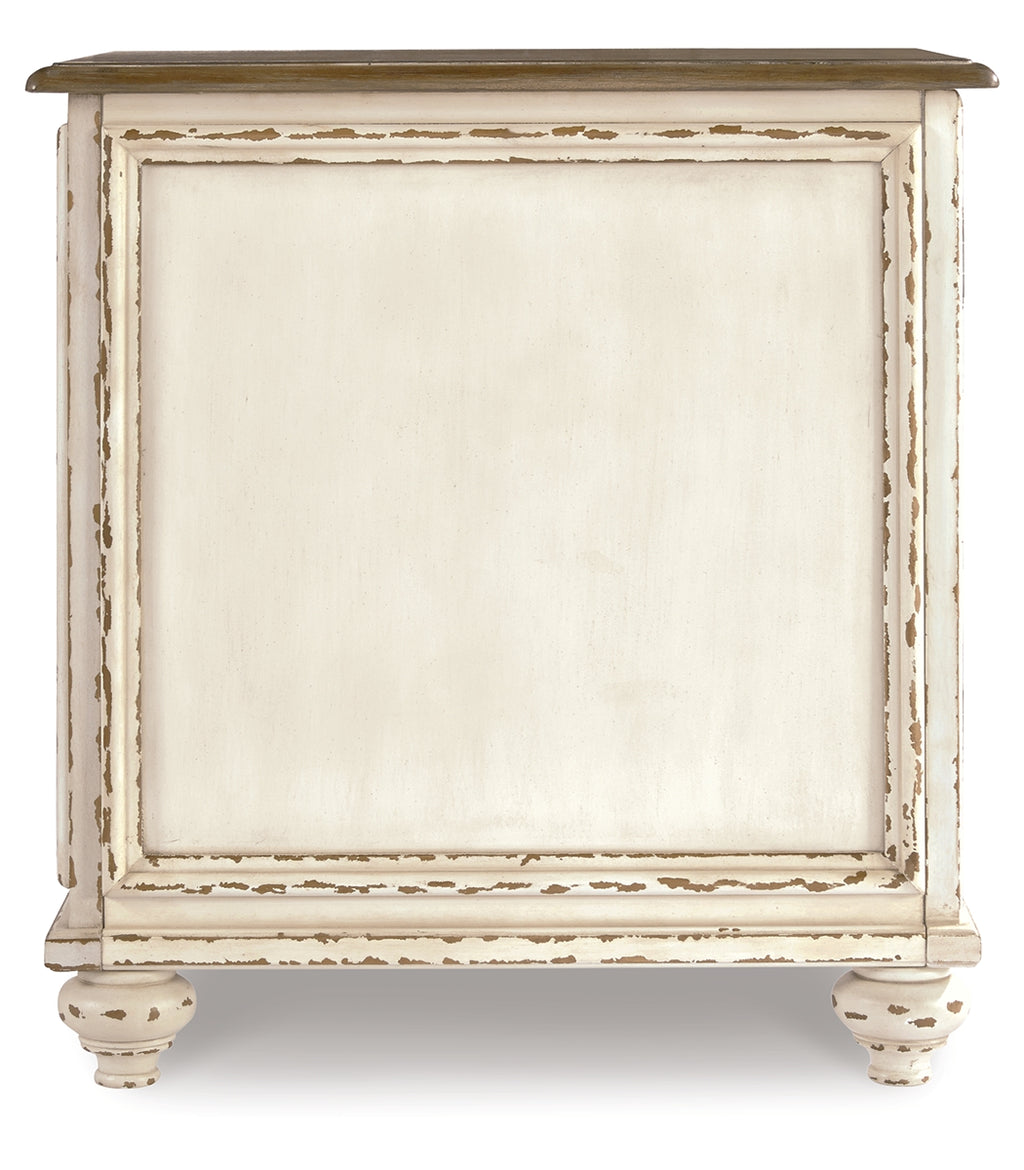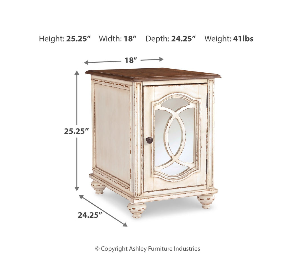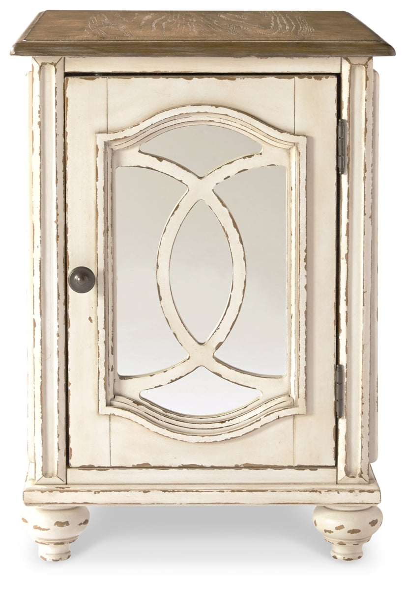 Elevating the art of traditional cottage styling, this chairside end table is sure to serve you beautifully for years to come. Antiqued two-tone aesthetic blends a chipped white with a distressed wood finished top for added charm. Cabinet door features inset mirror with filigree moulding for a fanciful twist. | Product Features