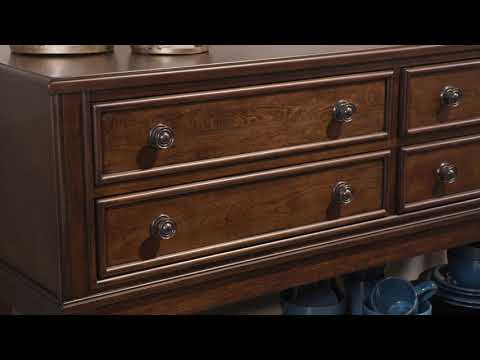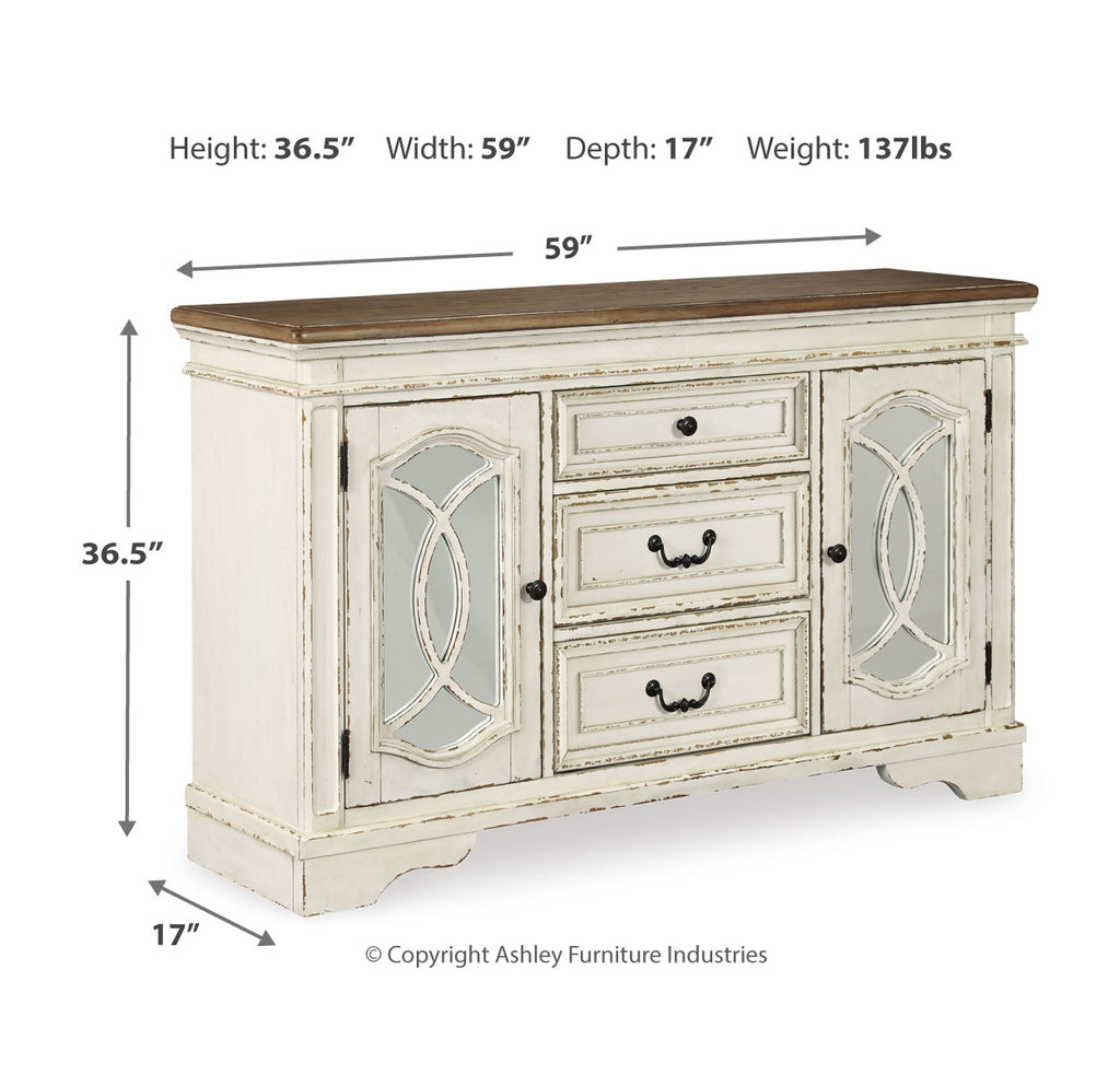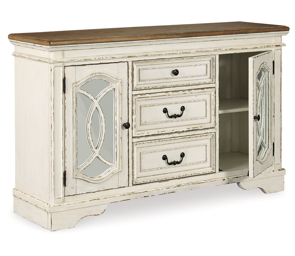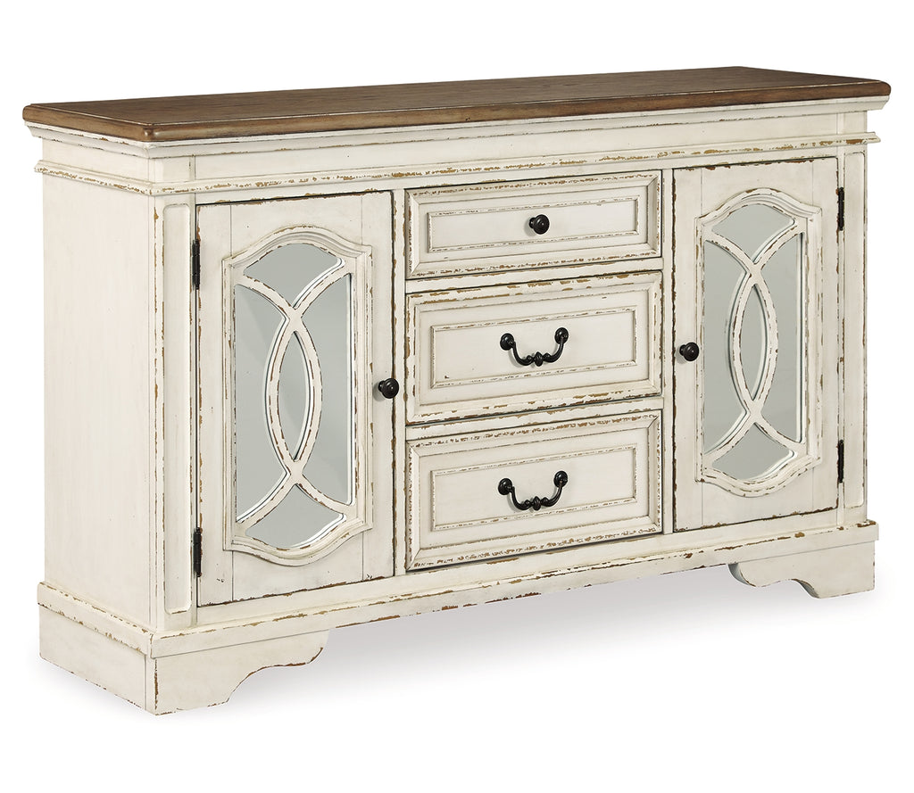 Serve up a French country-inspired feast for the eyes with this dining room server. Unique elements include cabinet storage beautified with decorative fretwork over mirrored glass and a doubly charming two-tone aesthetic pairing a chipped white with a distressed wood finished top. | Product Features