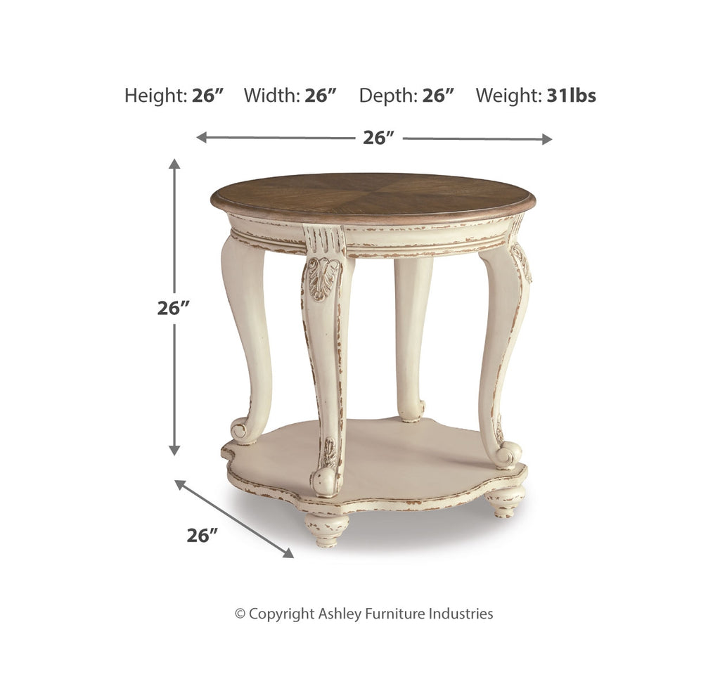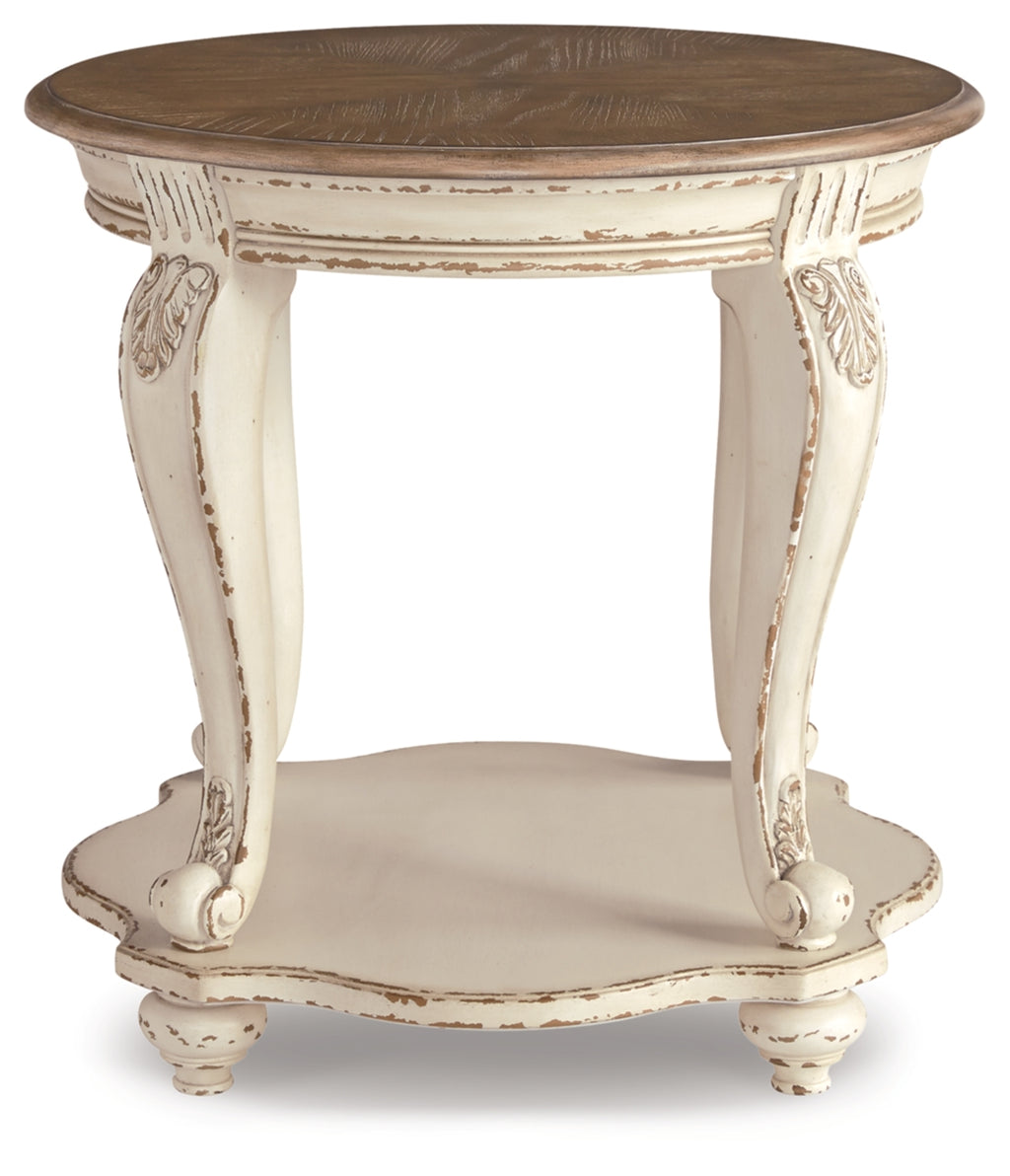 Elevating the art of traditional cottage styling, this round end table is sure to serve you beautifully for years to come. Antiqued two-tone aesthetic blends a chipped white with a distressed wood finished top for added charm. Classic cabriole legs and shapely lower shelf are a lovely twist. Decorative corbels add refinement. | Product Features