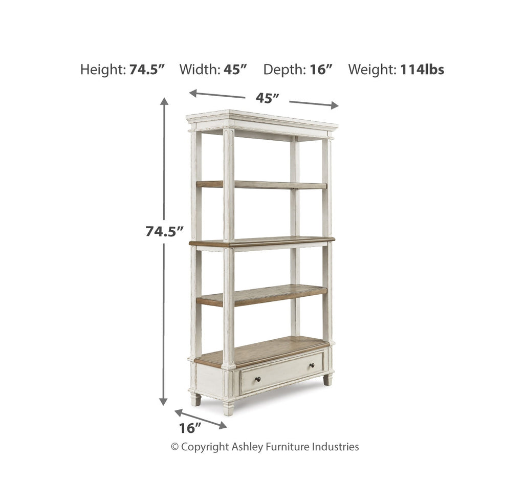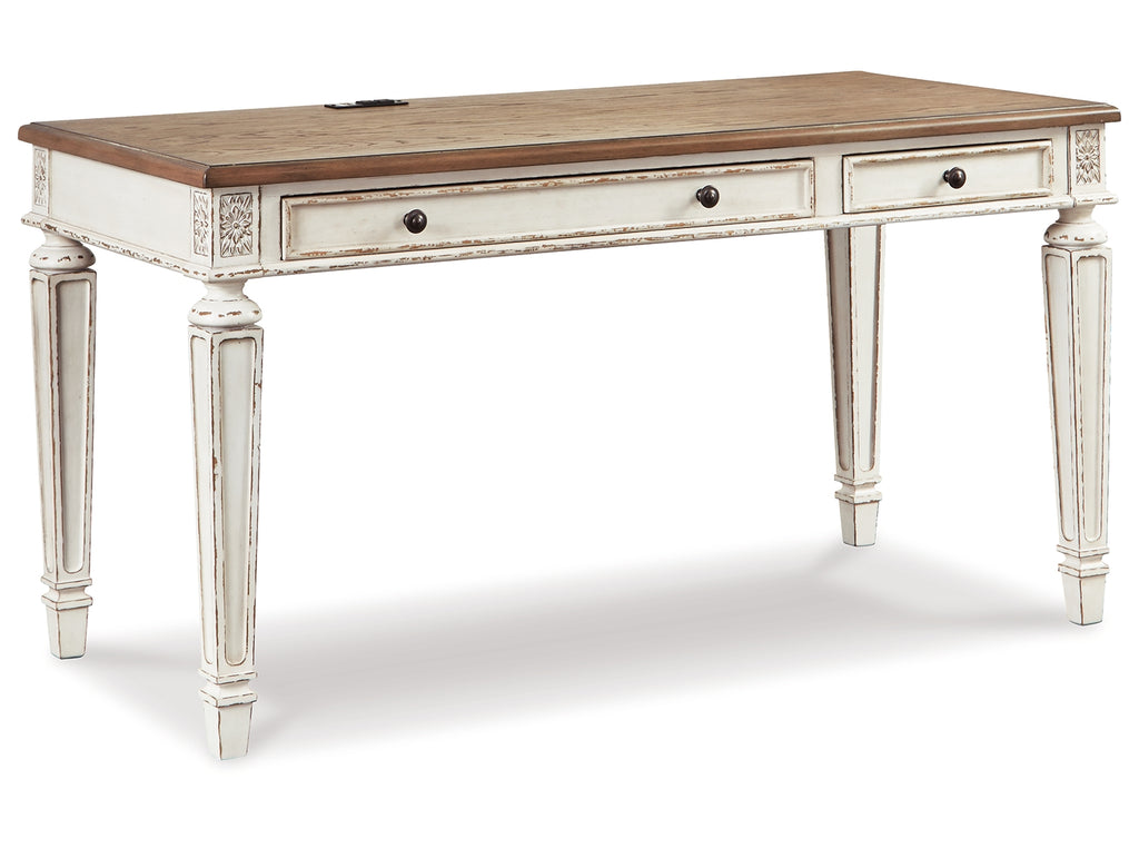 Elevating the art of traditional cottage styling, this designer desk and bookcase set is your heavenly home office realized. Antiqued two-tone aesthetic blends chipped white with distressed wood tone for added charm. Framed drawer fronts, decorative corbels and elegantly turned and tapered legs add refinement, while dark bronze-tone knobs lend a classic touch. Clever balance of shelf and drawer space beautifully works. | Product Features