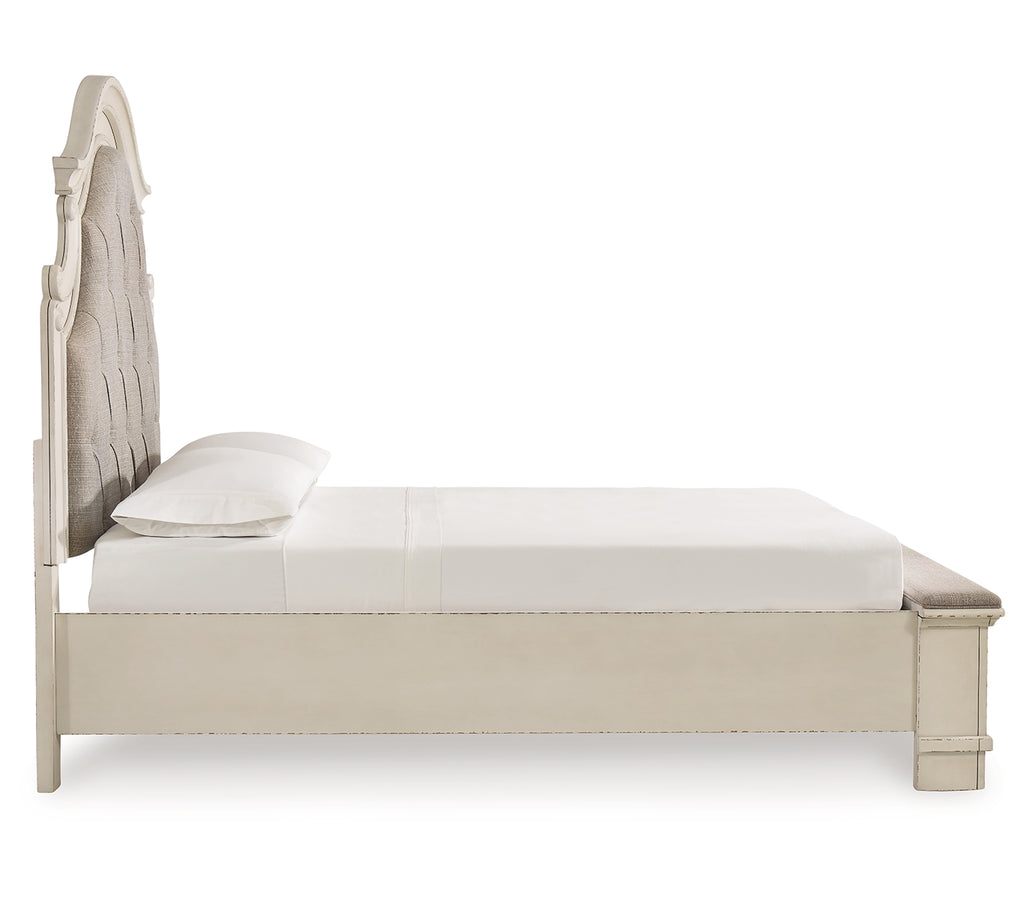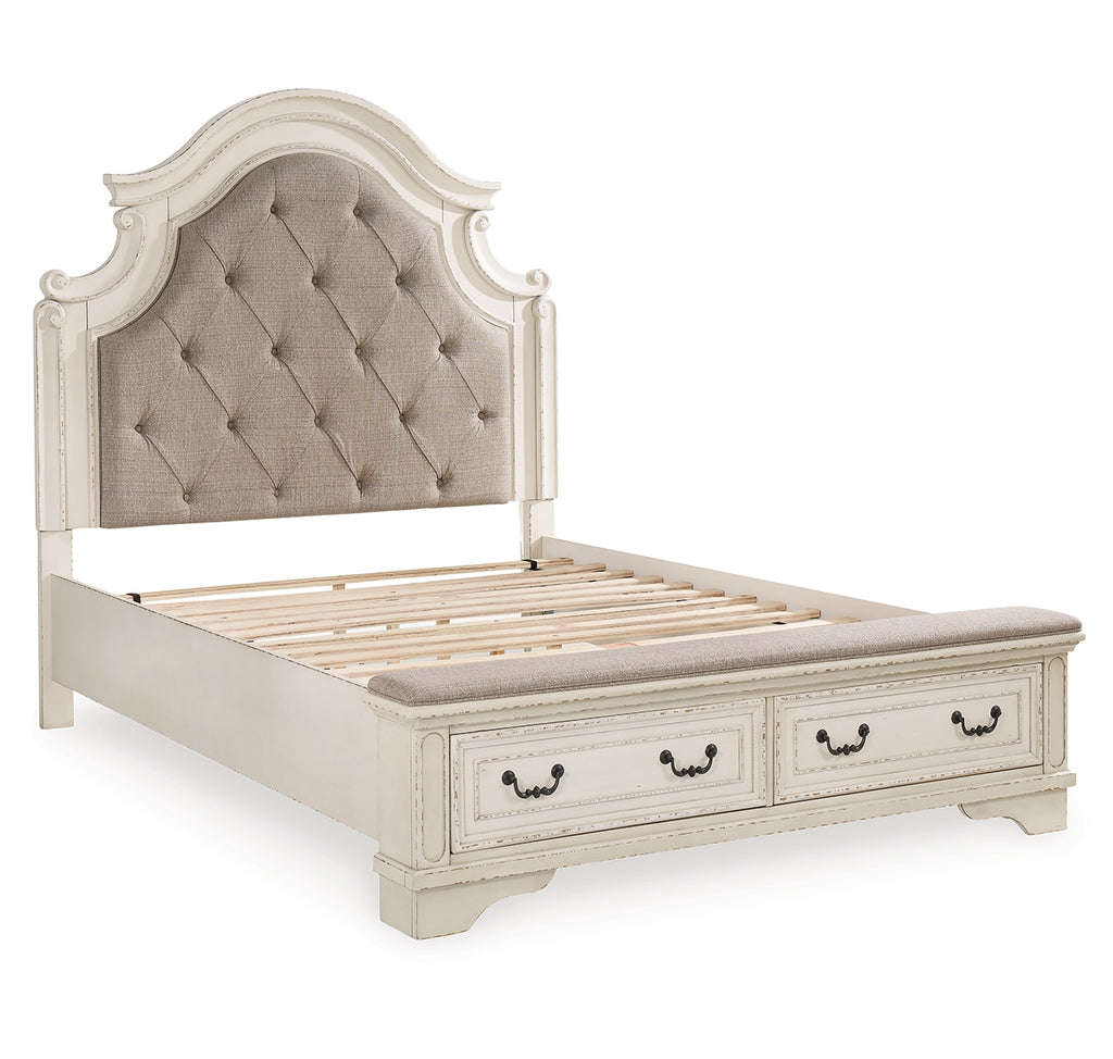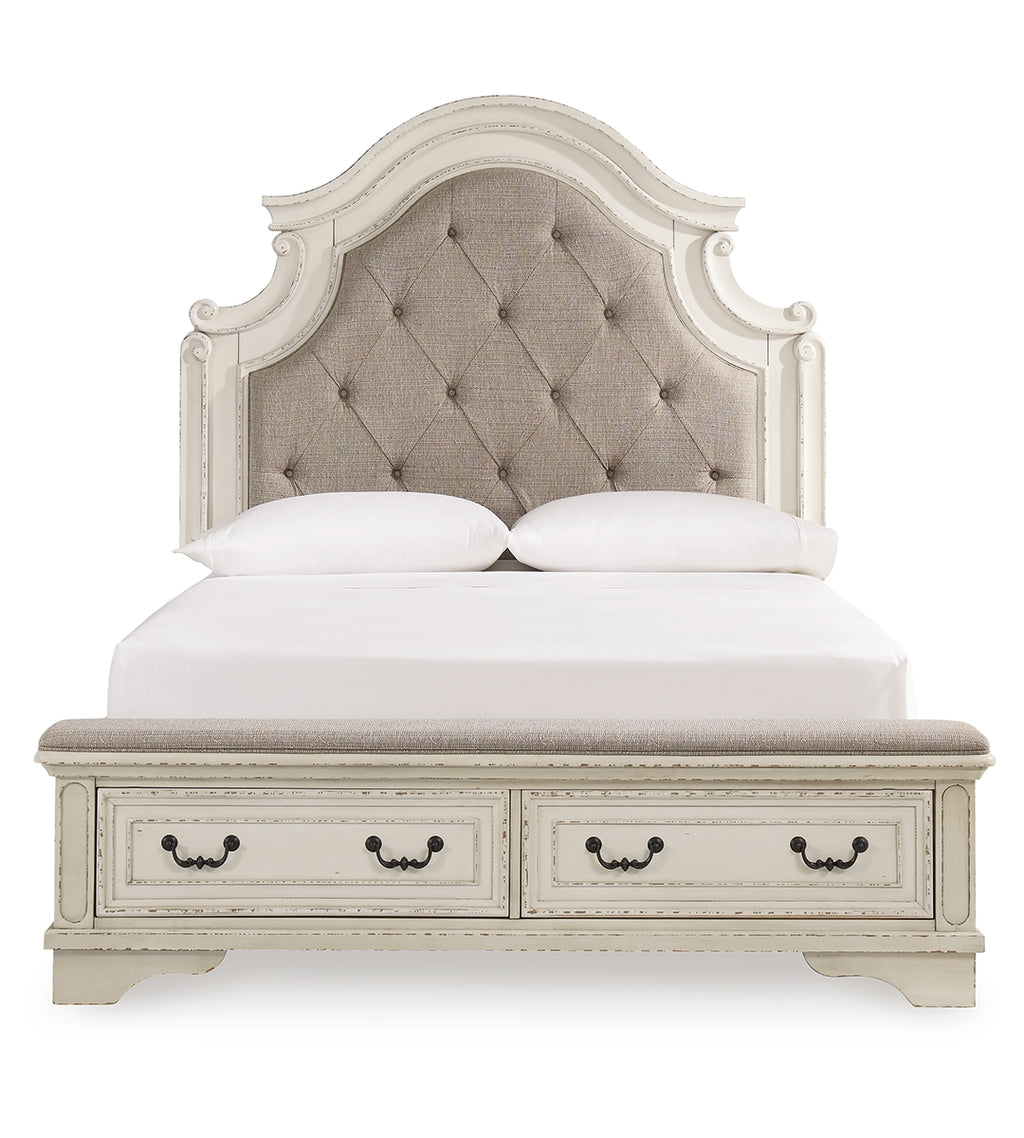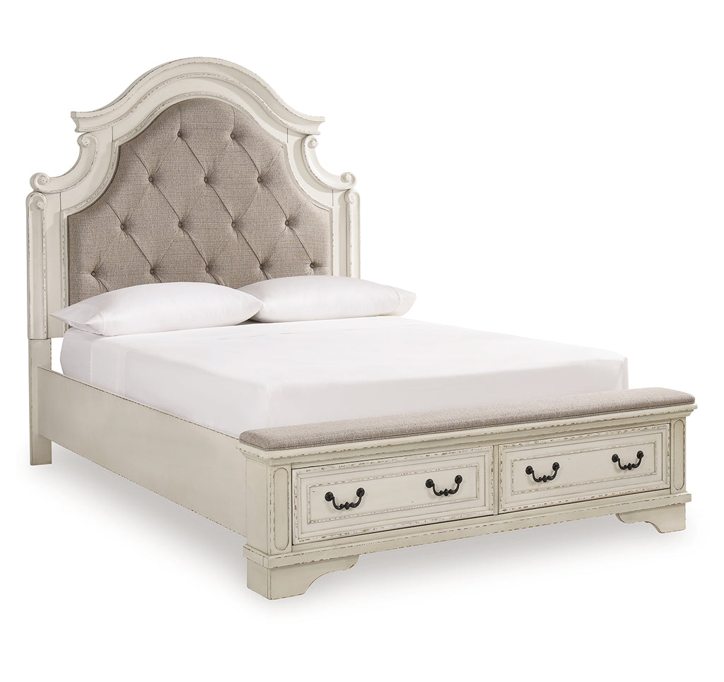 Redefining the art of traditional cottage styling, this queen upholstered bed is your dream bedroom retreat realized. The ornately shaped headboard with inset upholstered cushion brings cozy charm. Framed drawer fronts on the footboard add refinement, while drawer pulls in a dark bronze-tone finish lend a classic touch. A cushioned top rail elevates this stylish addition to a functional favorite.