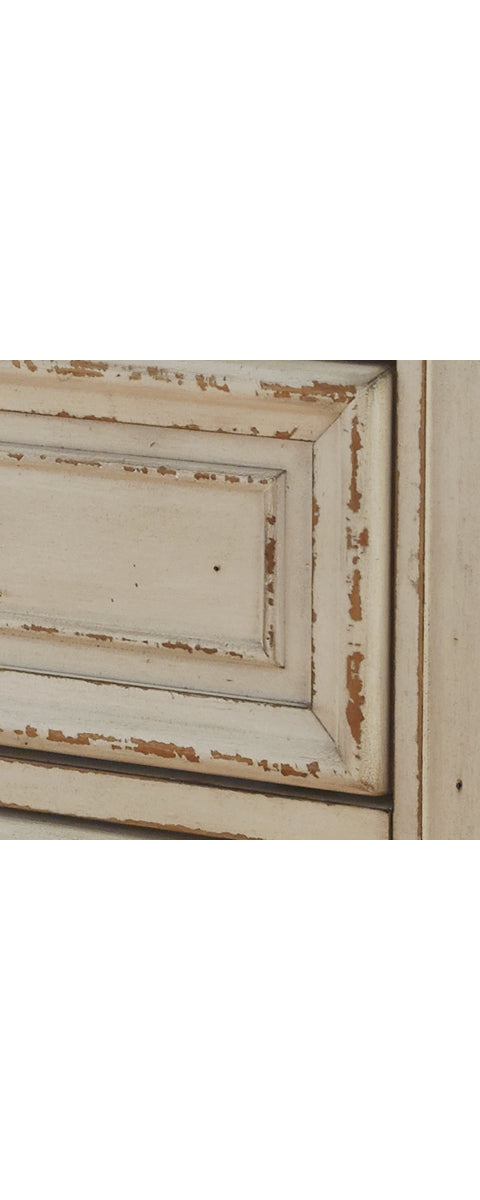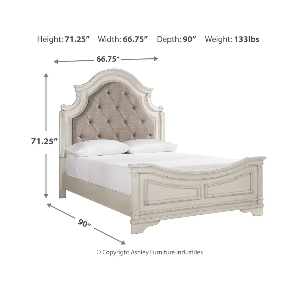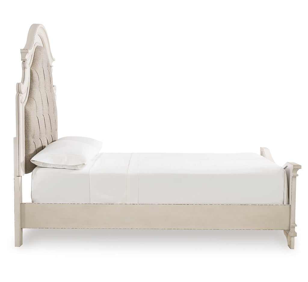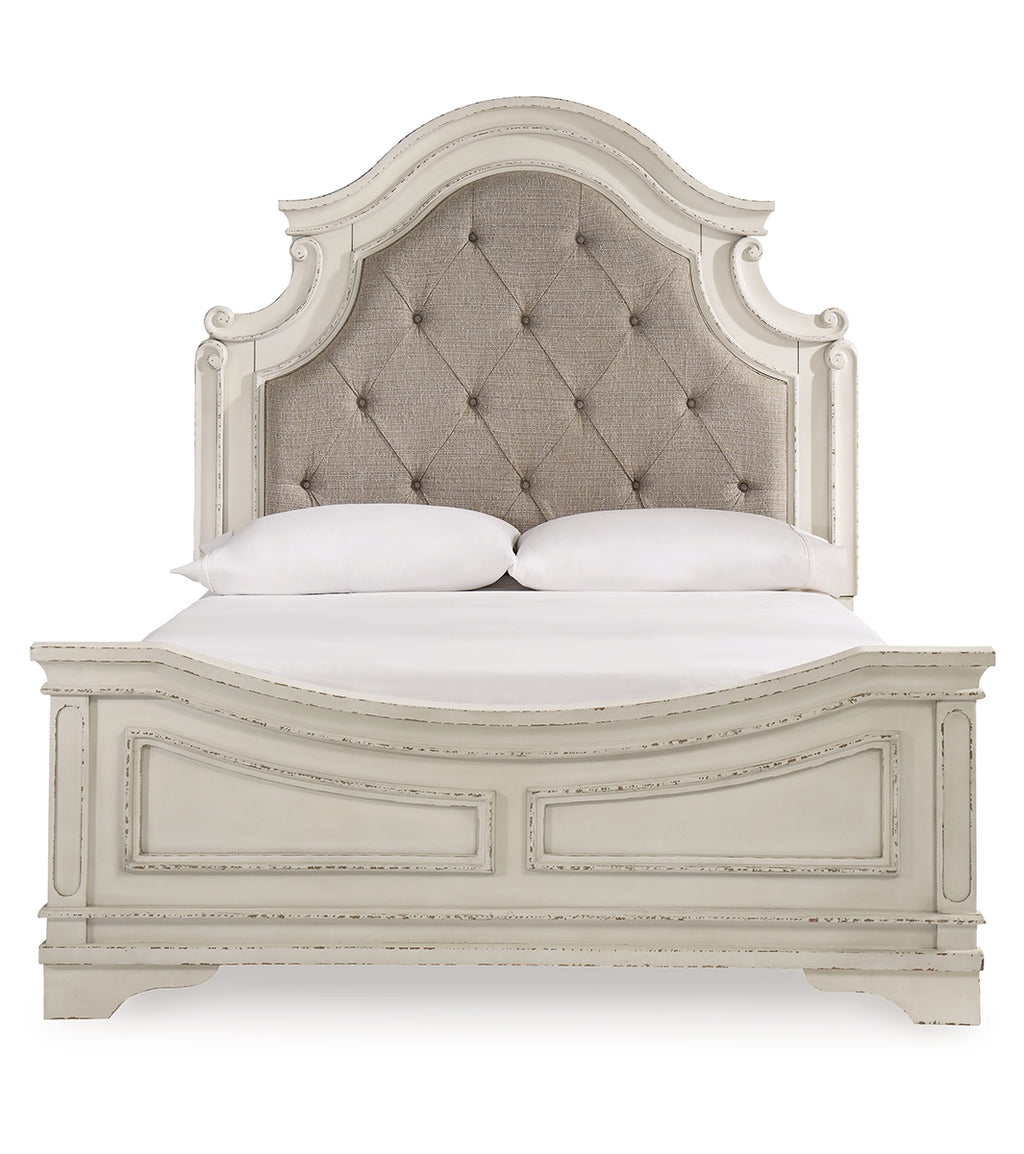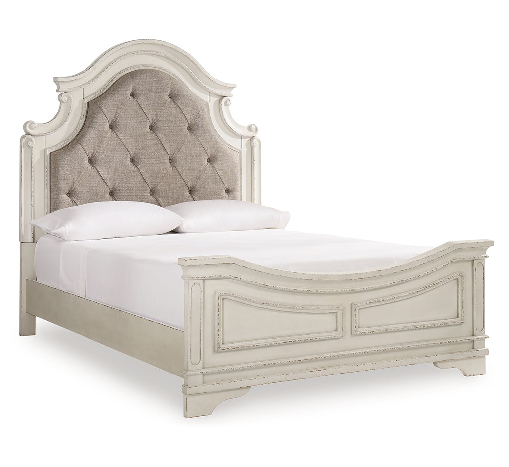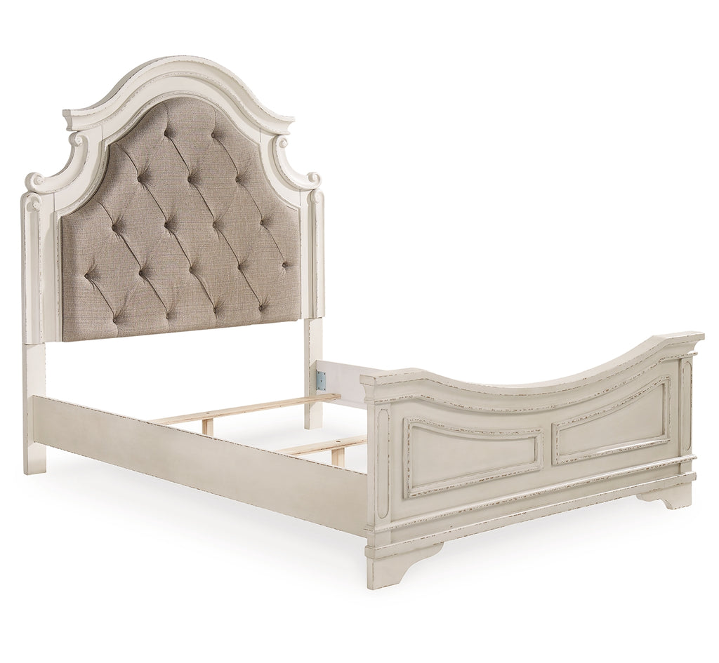 Elevating the art of traditional cottage styling, this queen upholstered bed is your dream bedroom retreat realized. A curvaceous beauty, this brilliant upholstered bed wows with dramatic scalloped details and fanciful trim work. The distressed chipped white finish charms with its heirloom appeal. Deep tufting on the cushioned upholstered headboard adds such a cozy element sure to put you at ease. Mattress and foundation/box spring available, sold separately. | Product Features
