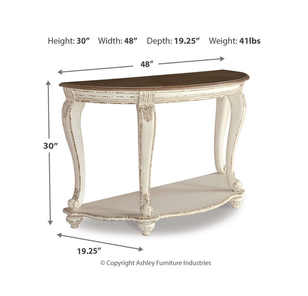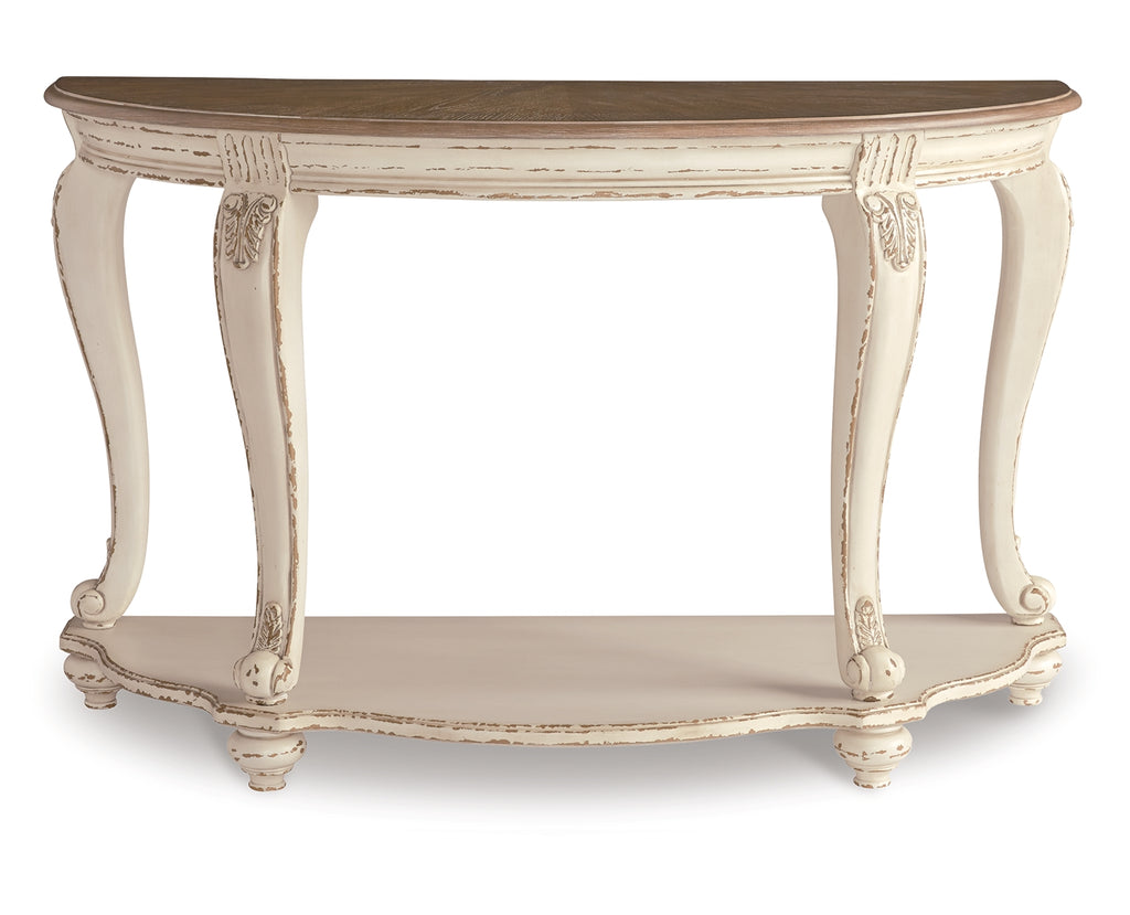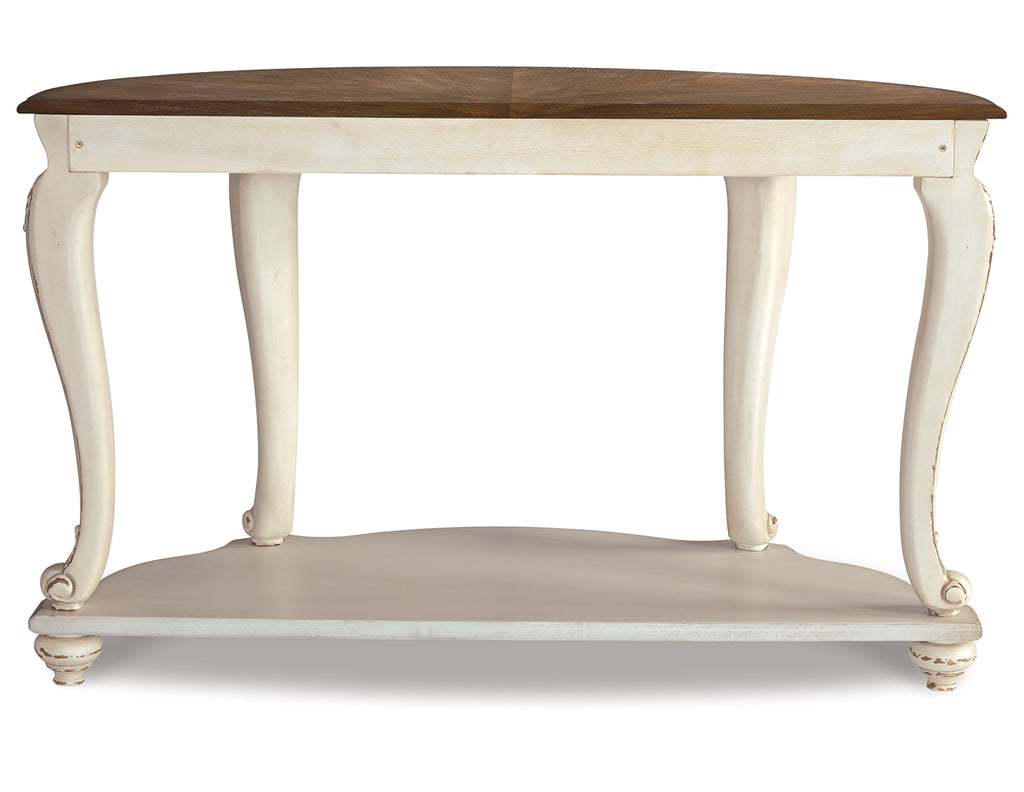 Elevating the art of traditional cottage styling, this demilune sofa table is sure to serve you beautifully for years to come. Antiqued two-tone aesthetic blends a chipped white with a distressed wood finished top for added charm. Classic cabriole legs and shapely lower shelf are a lovely twist. Decorative corbels add refinement. | Product Features