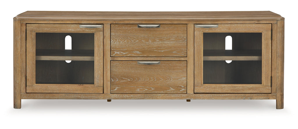 This TV stand's classic yet contemporary good looks are hard to deny. Softly shaped posts with a light oak finish and wire-brushed wood grain texture lend an organic appeal to your entertainment space. Roomy drawers are just the ticket for extra media storage and keeping day-to-day clutter at bay, while the shelf is ideal for fashionable display pieces. | Product Features