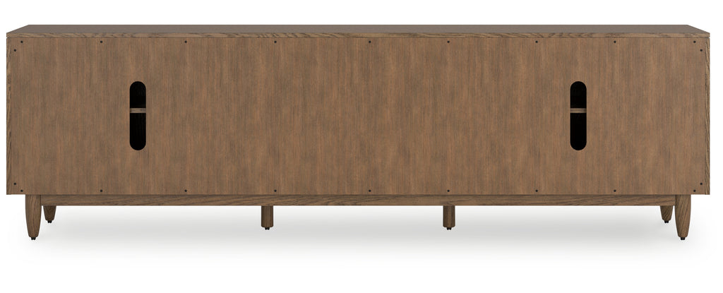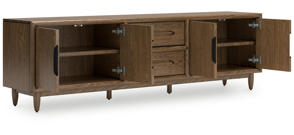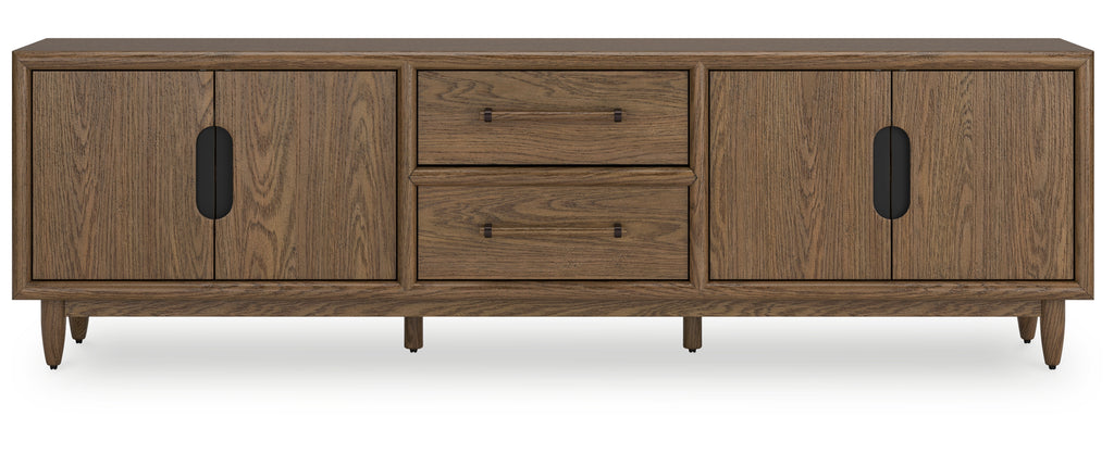 Introducing a TV stand inspired by the architectural language of mid-century expression. Its spacious cabinets and drawers provide ample storage, while a sleek design allows the natural beauty of the wood to shine through. Ready for a cinematic experience? This entertainment center is perfect for movie nights and relaxation. | Product Features