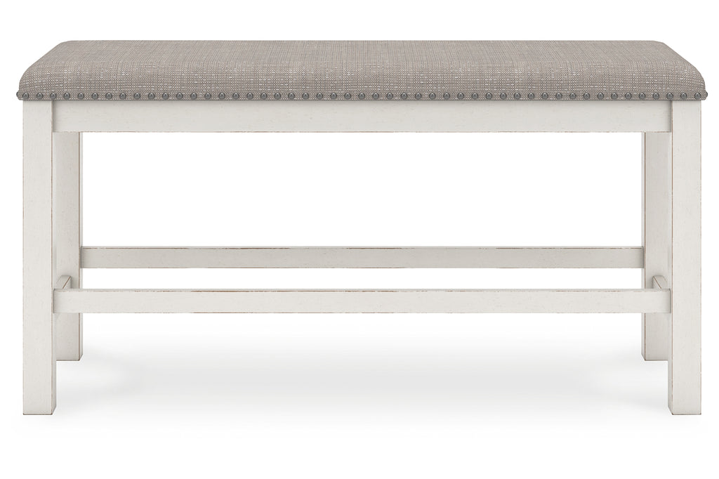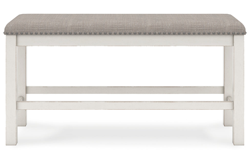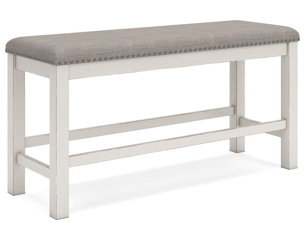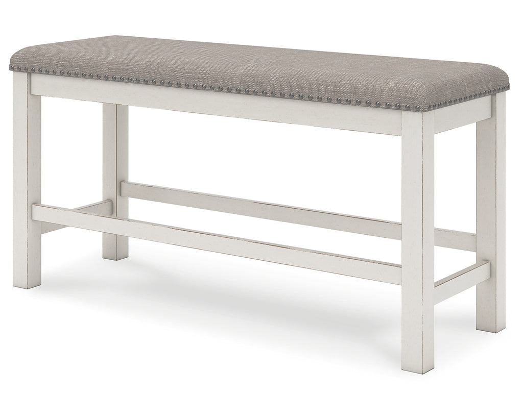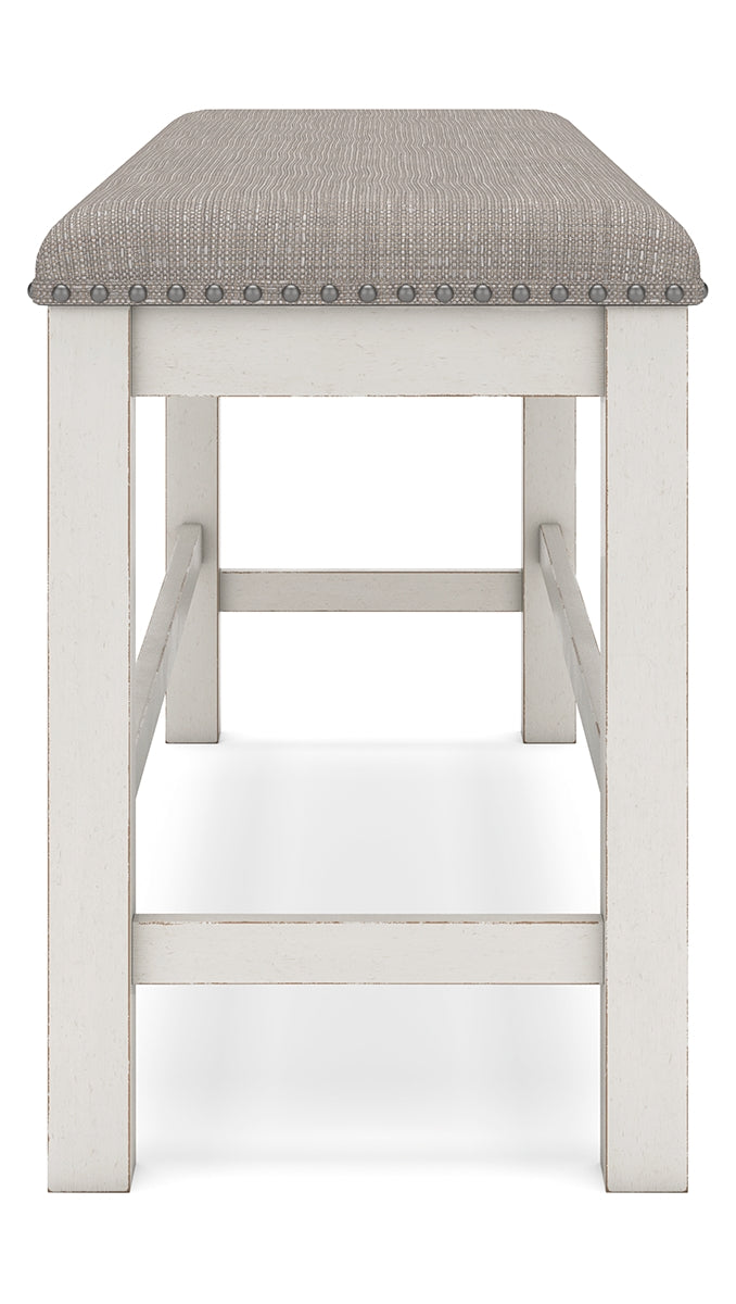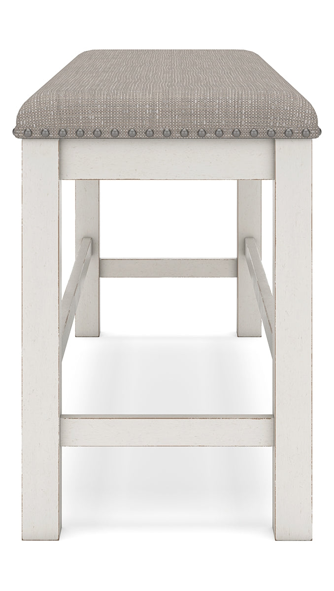 This counter height dining bench is sure to impress come mealtime. With its white finish and light gray upholstery, farmhouse-style seating has never been so fashionable. All that’s missing is you and your family.
