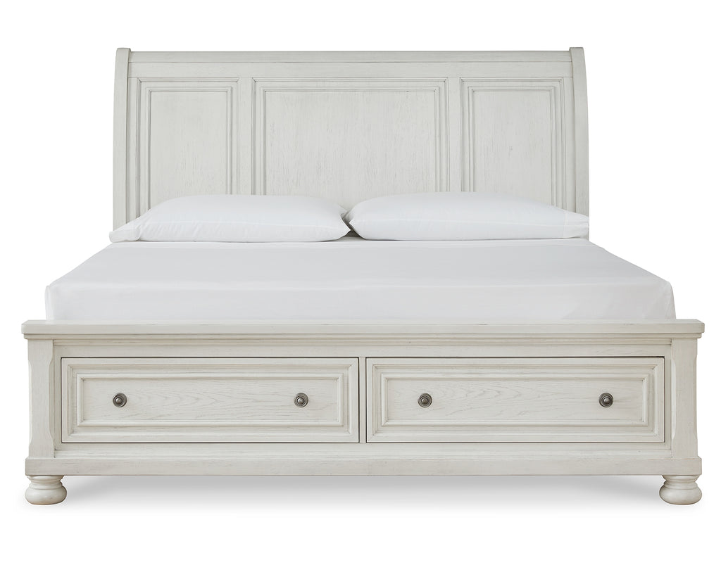 Elegant, timeless furnishings take your bedroom to the next level. Nothing does that better than this California king sleigh bed with storage footboard. The antiqued white finish with a wonderful grain texture radiates sophistication, while the dark bronze-tone hardware adds an ornate touch. Rounding things out, the subtle curve of the headboard keeps the look polished and poised. | Product Features