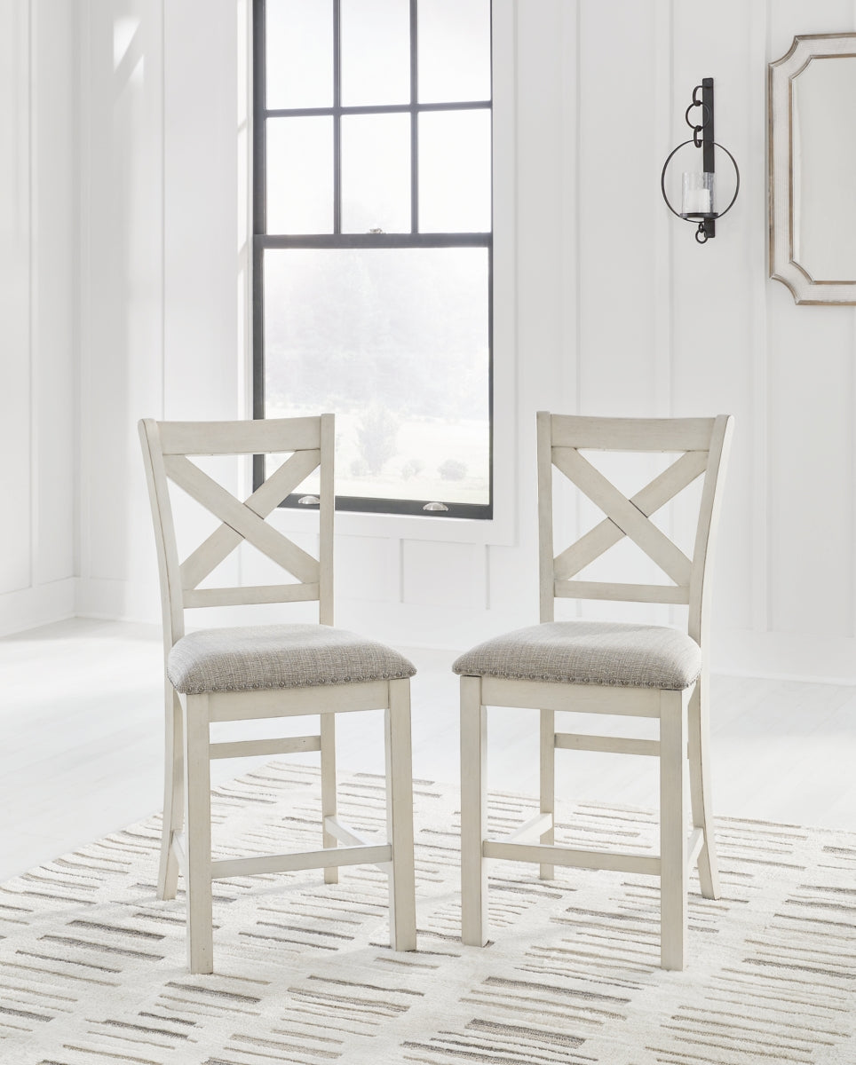 This counter height bar stool is sure to impress come mealtime. With its white finish and light gray upholstery, farmhouse-style seating has never been so fashionable. All that’s missing is you and your family. | Product Features