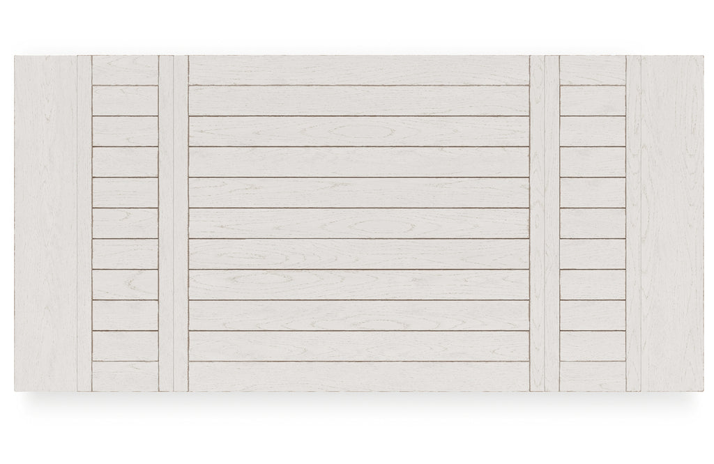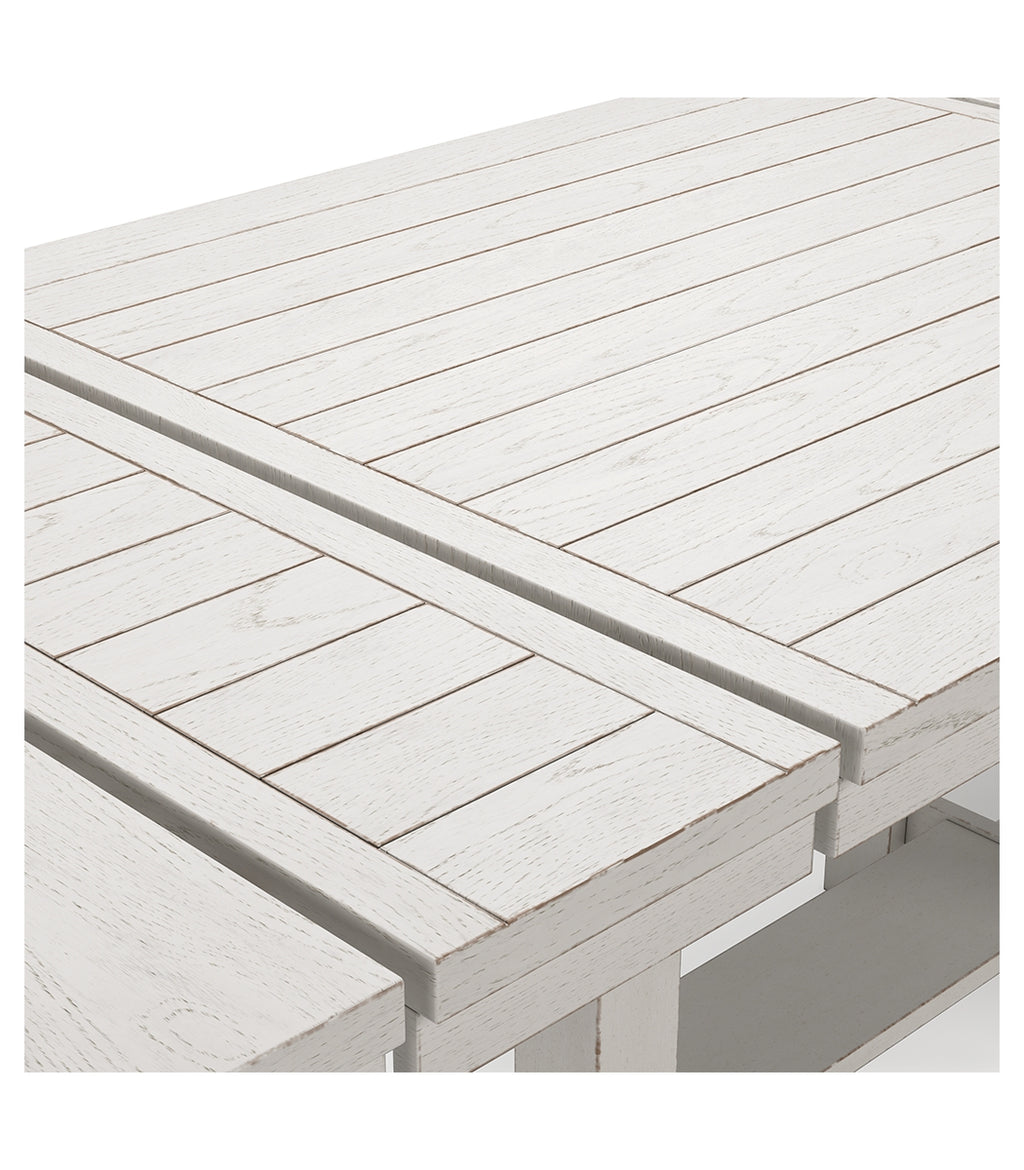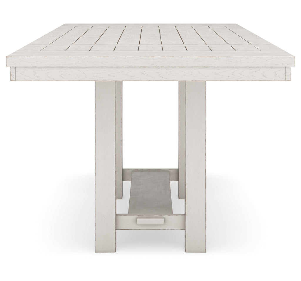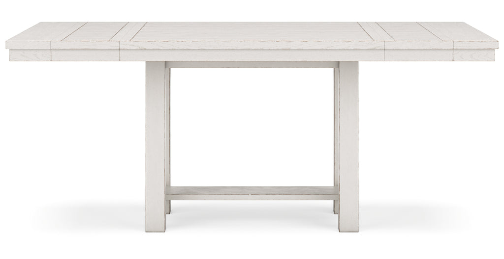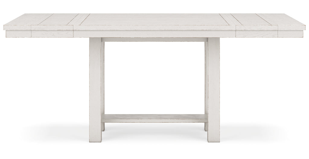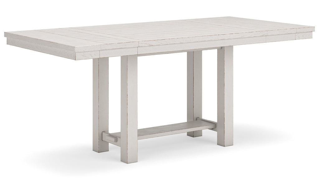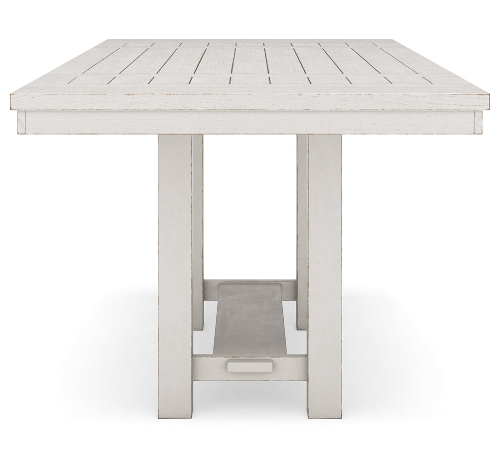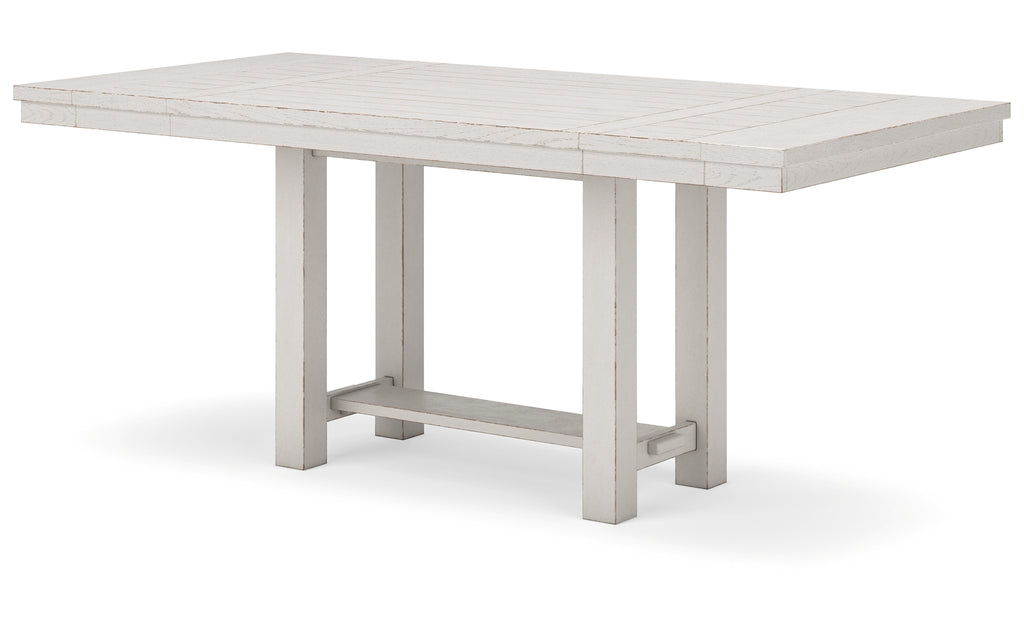This counter height dining table is sure to impress come mealtime. With its antiqued white finish and a planked effect tabletop that extends for additional seating, farmhouse-style dining has never been so fashionable. All that’s missing is you and your family. | Product Features