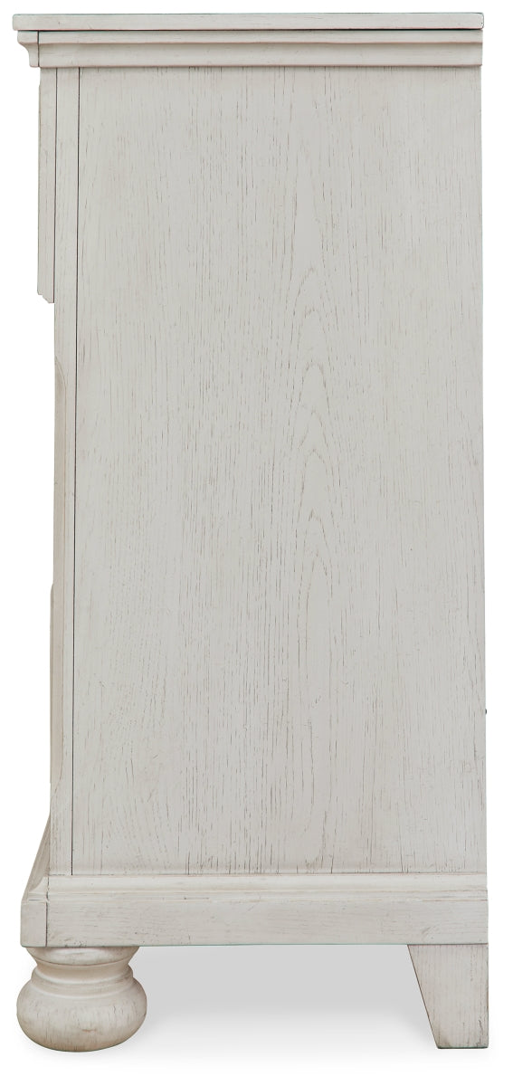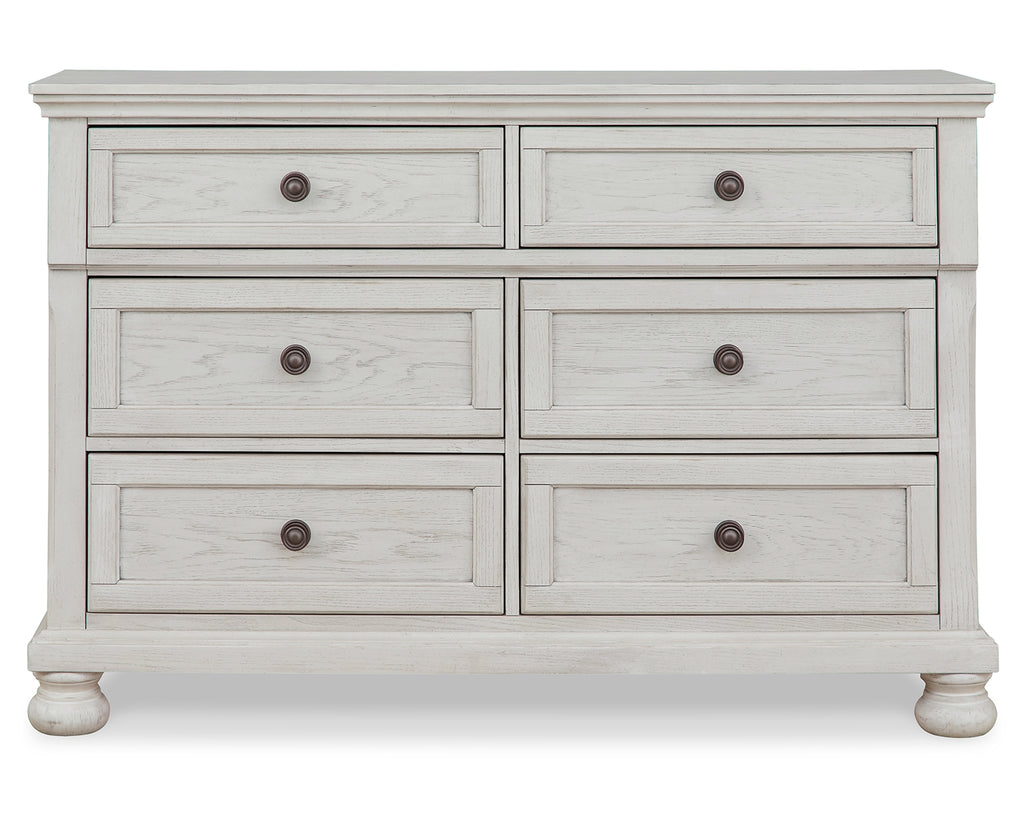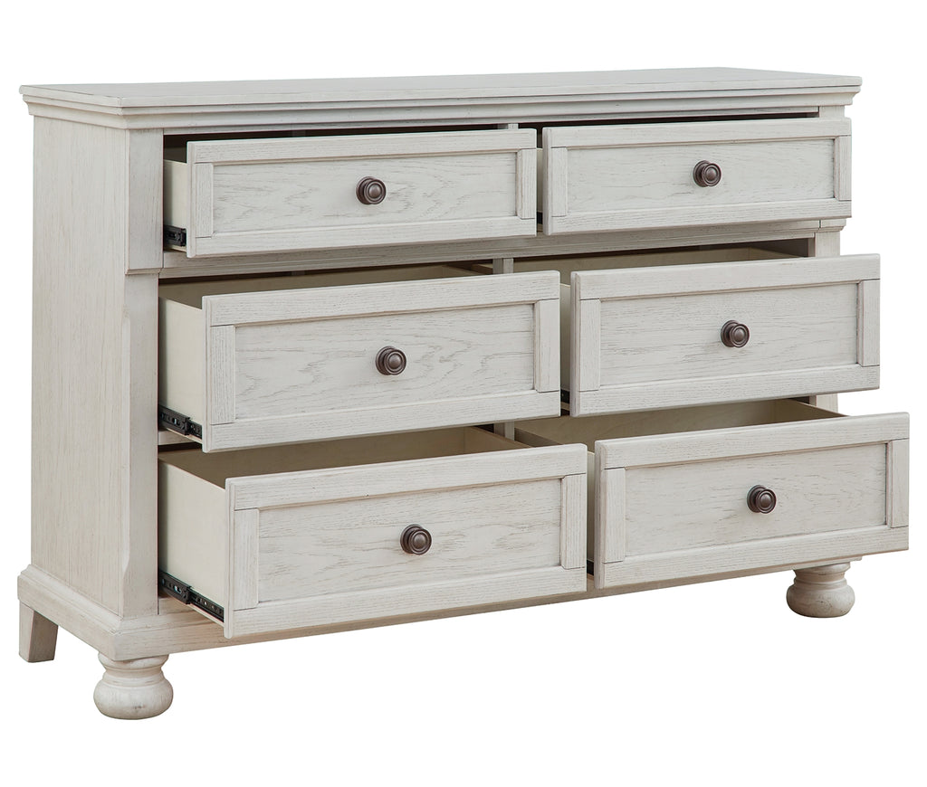 Elegant, timeless furnishings take your bedroom to the next level. Nothing does that better than this dresser. The antiqued white finish with a wonderful grain texture radiates sophistication, while dark bronze-tone knobs add an ornate touch. Felt finishing in the upper drawers rounds out this tasteful piece. | Product Features
