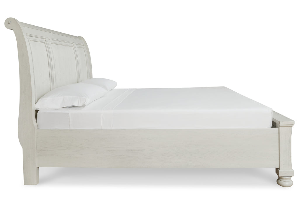 Elegant, timeless furnishings take your bedroom to the next level. Nothing does that better than this king sleigh bed with storage footboard. The antiqued white finish with a wonderful grain texture radiates sophistication, while the dark bronze-tone hardware adds an ornate touch. Rounding things out, the subtle curve of the headboard keeps the look polished and poised. | Product Features