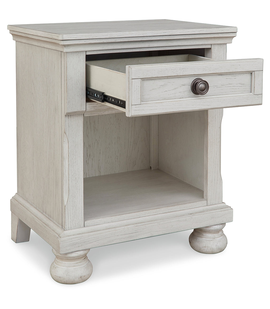 Elegant, timeless furnishings take your bedroom to the next level. Nothing does that better than this nightstand. The antiqued white finish with a wonderful grain texture radiates sophistication, while a dark bronze-tone knob adds an ornate touch. A single drawer and open bookcase cubby allow for versatile storage or display options, making this nightstand a functional favorite. | Product Features