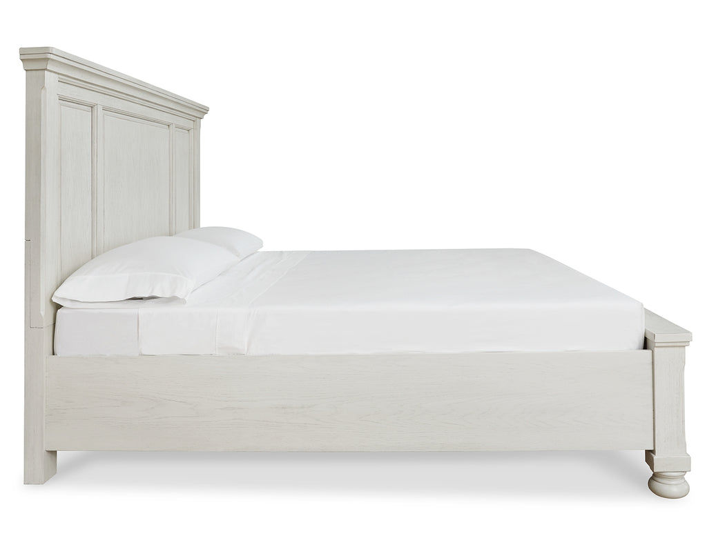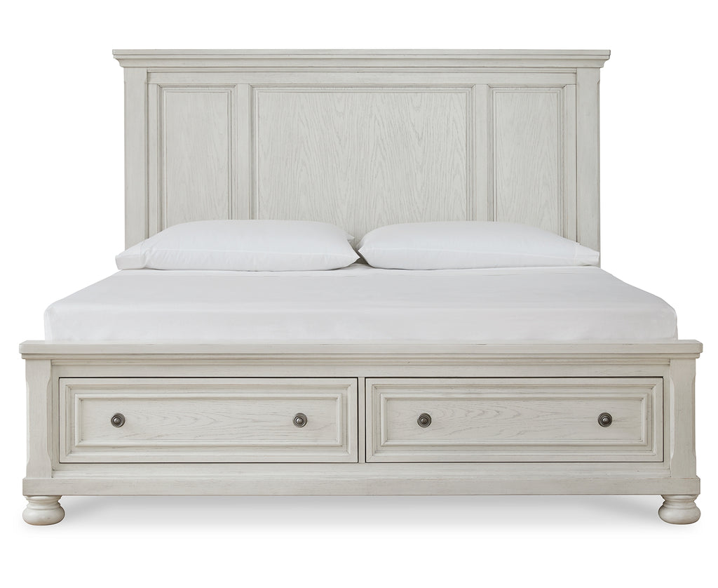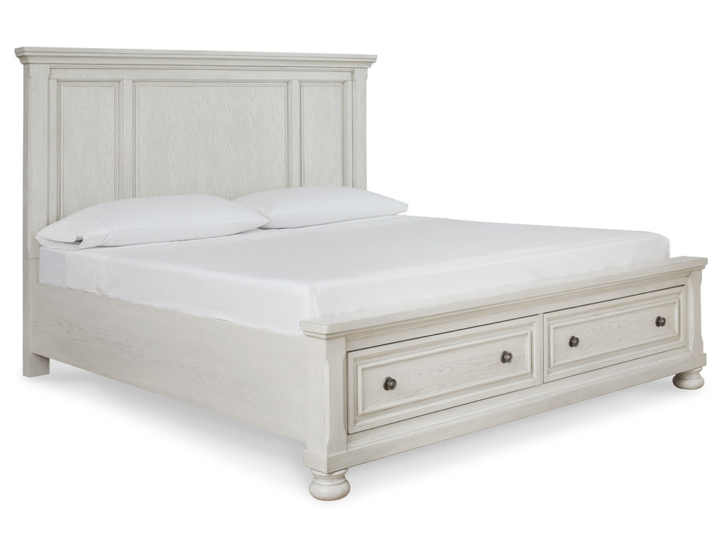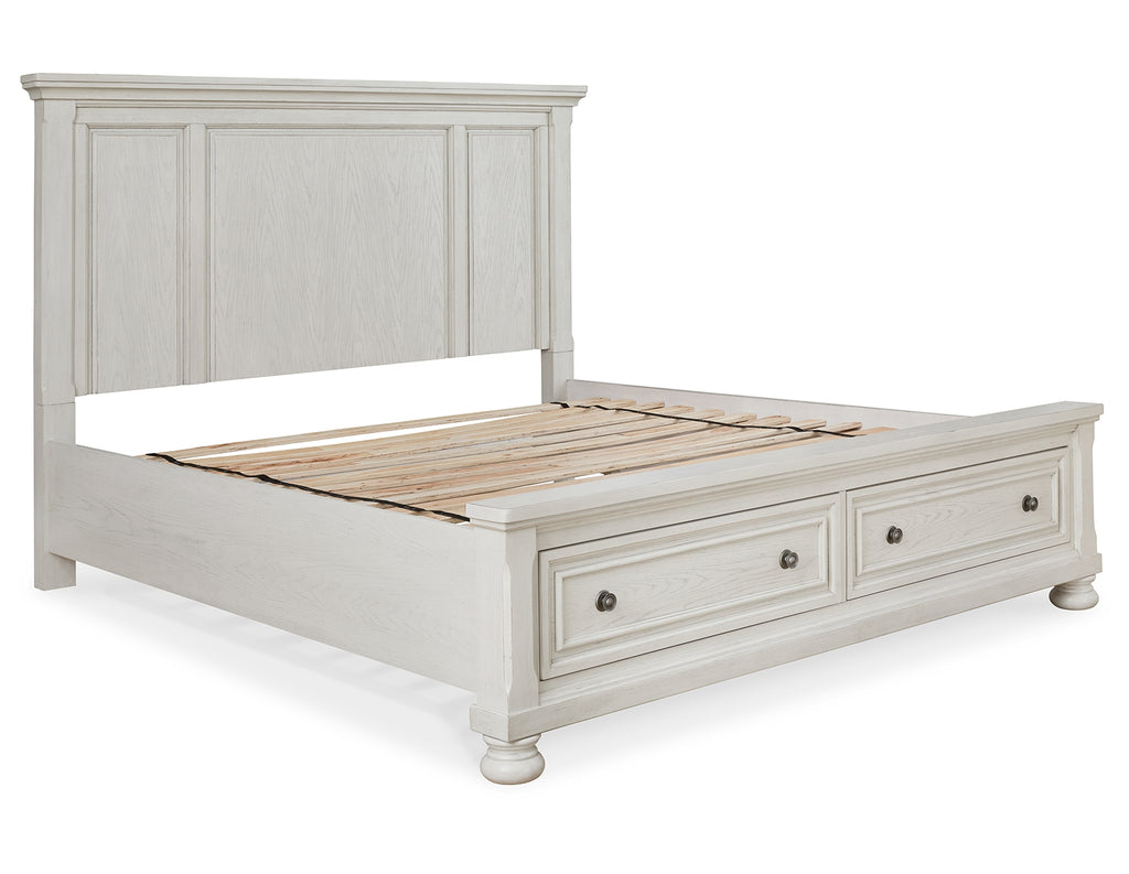 - Includes panel headboard, storage footboard and rails with roll slats