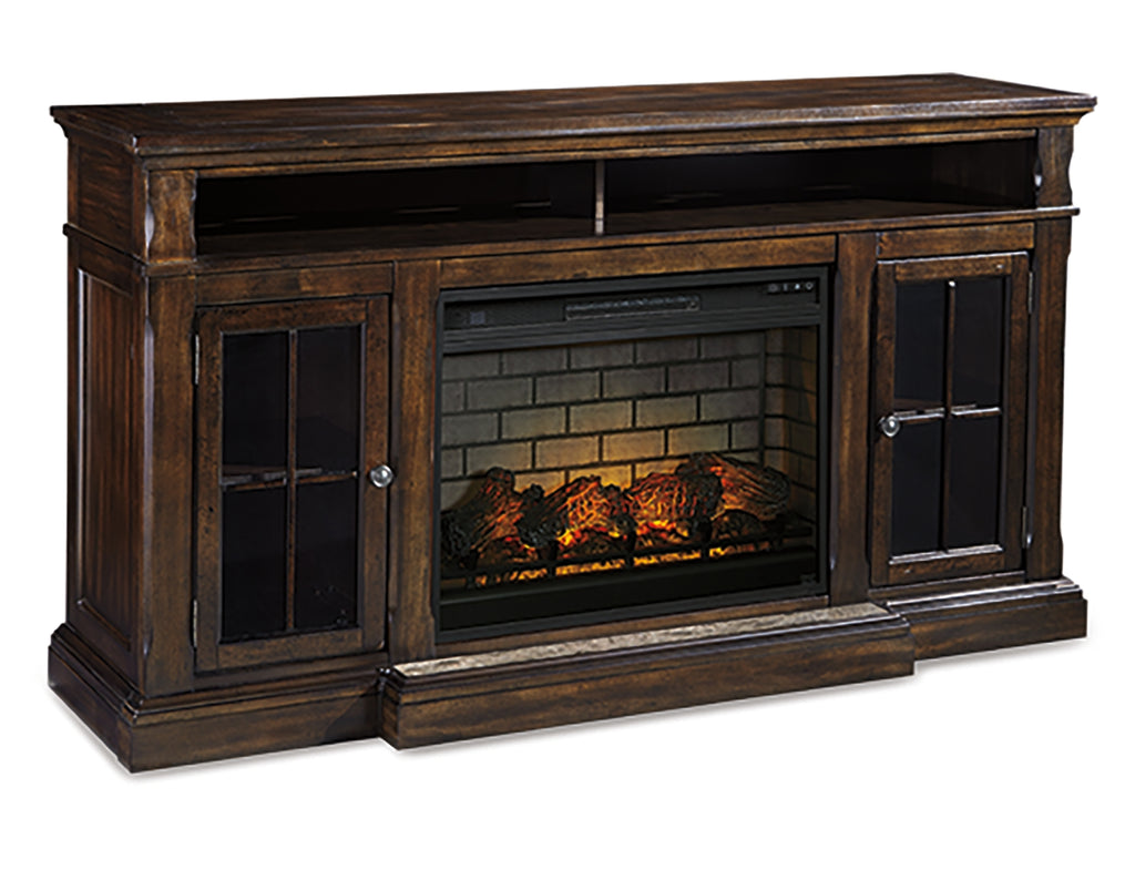The beauty of this TV stand will immediately engage you. Its slight breakfront shape is a rare find and an ideal fit among traditional and eclectic tastes. Soft black undertones highlight the warm finish. Multiple cubbies and glass-door enclosed shelves organize your audio/video components and plenty of extras. And what really turns up the heat: an electric infrared fireplace insert with faux firebrick surround that operates with or without infrared heat. With the touch of a button, adjust the temperature and the flame brightness, and set the timer for long-lasting enjoyment. | Product Features