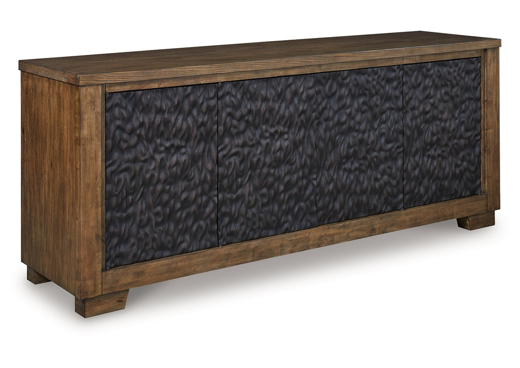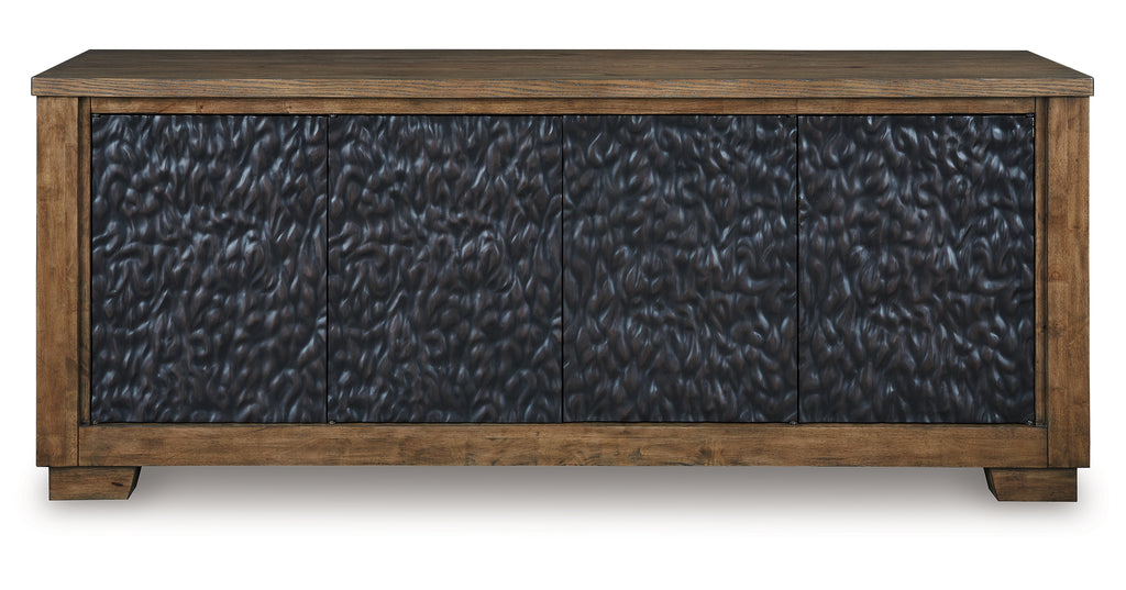 This TV stand is not just furniture—it’s a work of art. The cabinet door design is nothing short of a masterpiece. Its deep tribal texture and two-tone finish convey an intentional hand-carved feel creating a unique and attractive surface. Boasting an abundance of storage space and cord management, the large-scale silhouette accommodates flat screen TV’s up to 85 inches. | Product Features