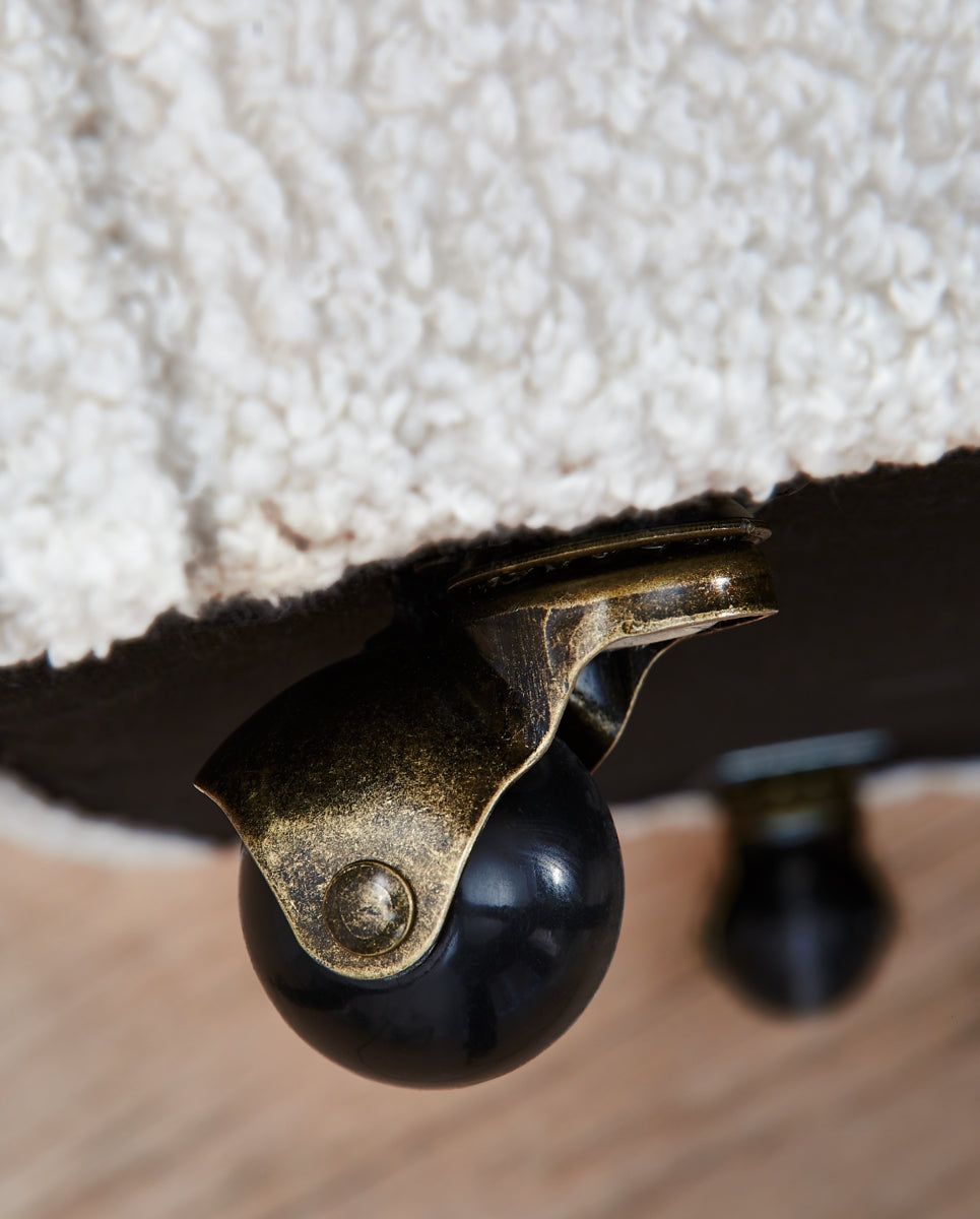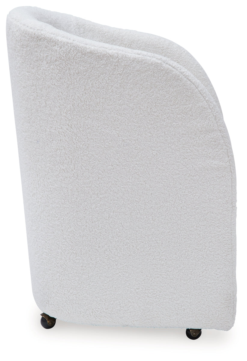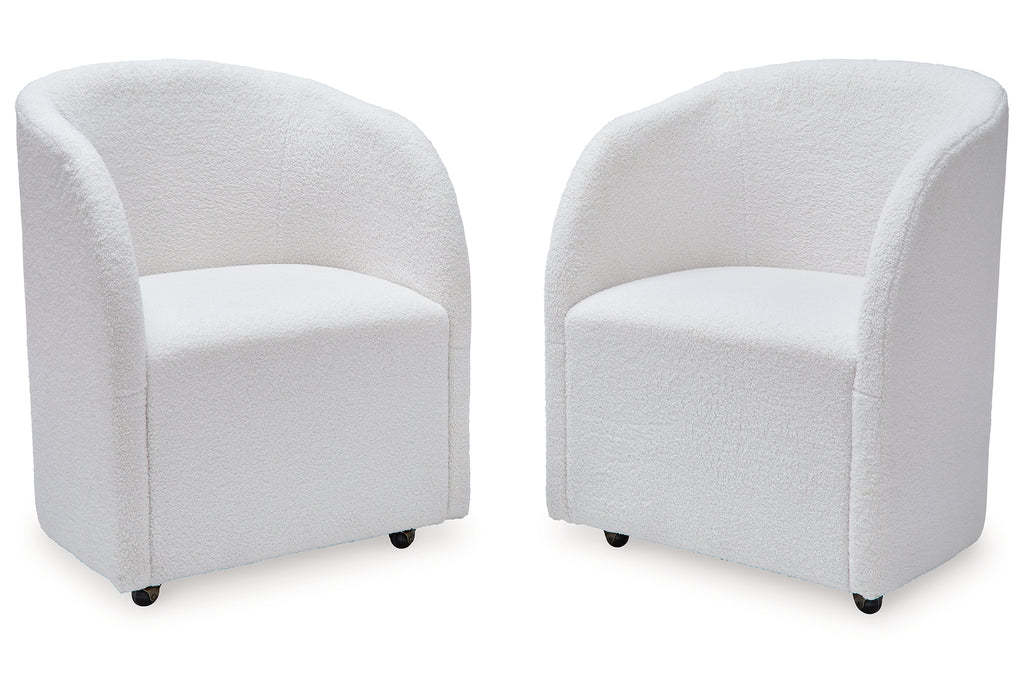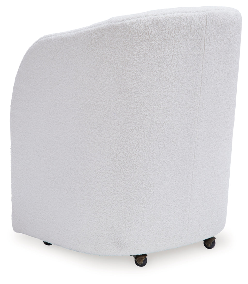 Inspired by art deco design, this fully upholstered dining chair makes a lasting impression in a simply stunning way. Its magnificent curved silhouette is enhanced with a neutral boucle upholstery that’s so pleasing to the palate. This is the piece you’ve been looking for to elevate your contemporary decor whether you’re dining, listening to your latest playlist or binge-watching with friends. Plus, it’s set on casters so it’s easy to move around. | Product Features