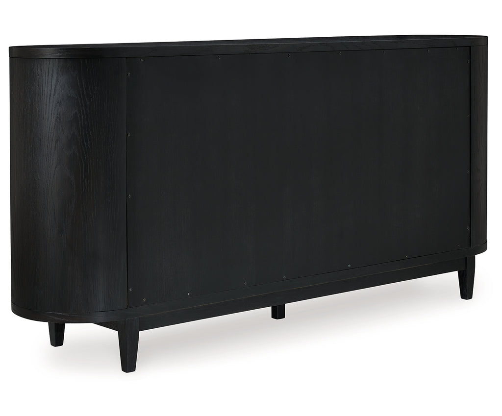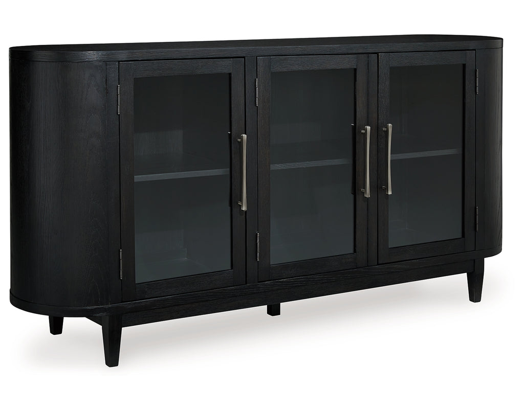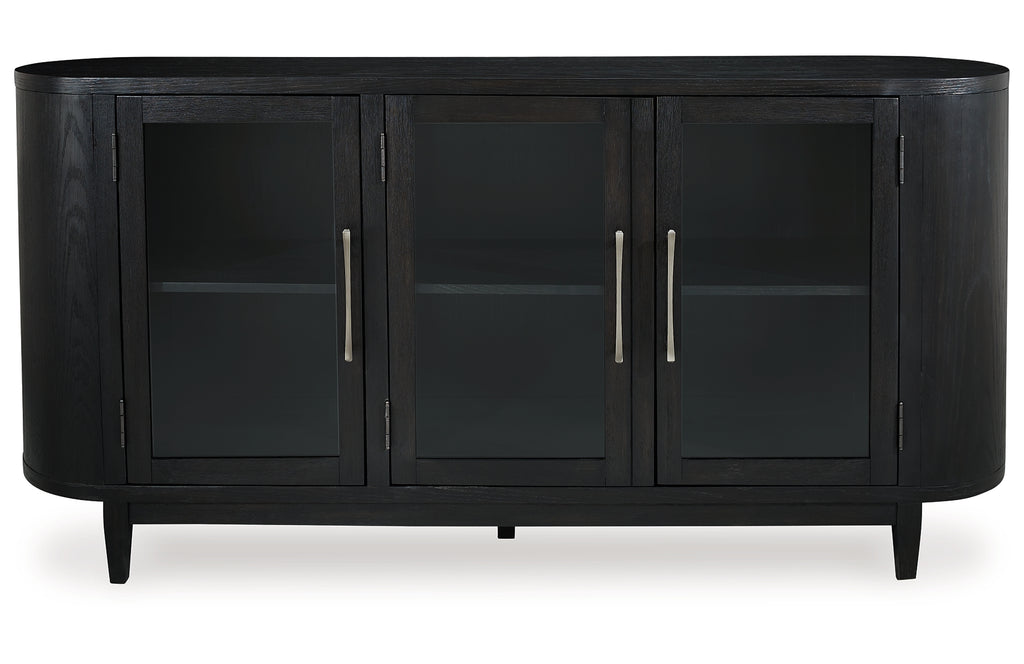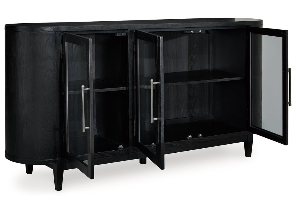 Inspired by art deco design, this dining server makes a lasting impression in a simply stunning way. Its magnificent rounded silhouette is enhanced with a rich layered black finish on the textured wood grain surface. Complete with glass cabinet doors, interior shelving and tapered legs, it’s the contemporary statement piece you’ve been seeking to elevate late-night dinners and full-on family feasts. | Product Features
