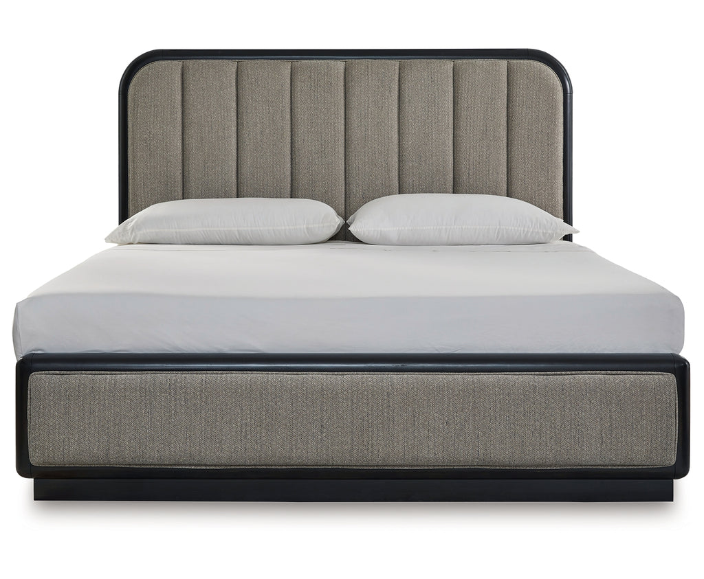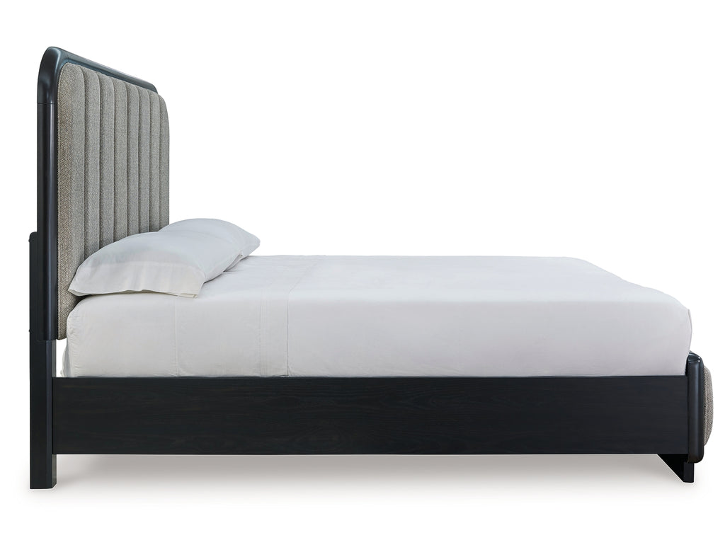 Inspired by art deco design, this softly shaped king upholstered panel bed makes a lasting impression in a simply stunning way. Its magnificent curved silhouette is enhanced by a rich layered black finish on the textured wood grain surface. The channeled vertical headboard and footboard, wrapped in herringbone textured upholstery, merge form and function. This is the statement piece you’ve been dreaming of to elevate your contemporary inner sanctum. | Product Features