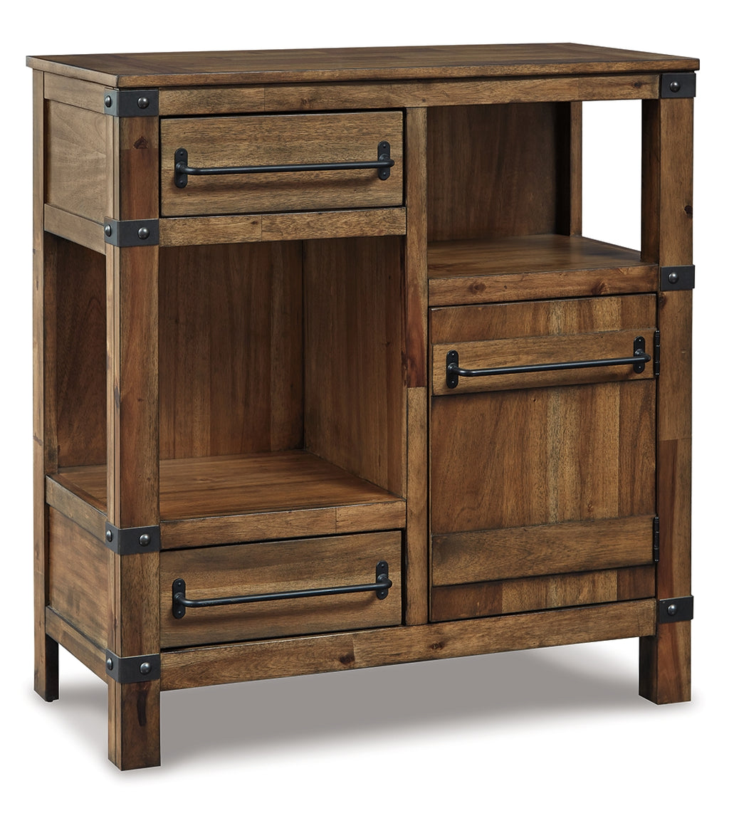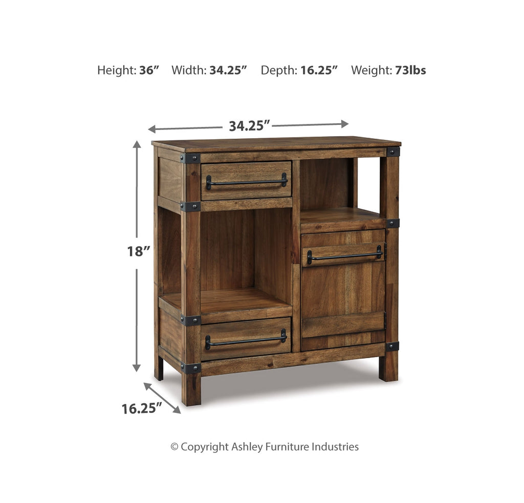 Accentuate your affinity for modern farmhouse living with this accent cabinet. Distinctive features include a natural acacia colored finish, dark bronze-tone industrial hardware and a butterfly matched inlay pattern that’s a work of art. Merging drawer and cabinet storage with open display space, this richly crafted cabinet is loaded with possibilities. | Product Features