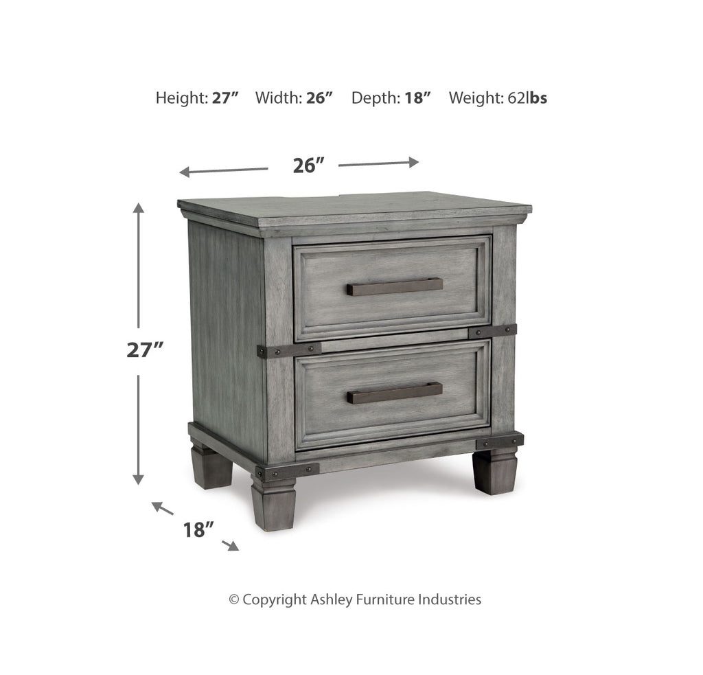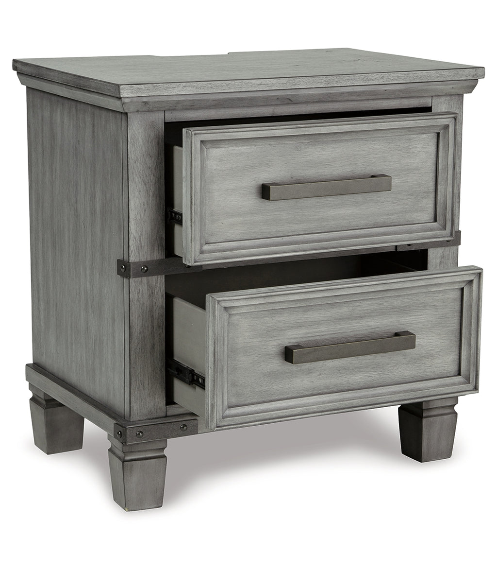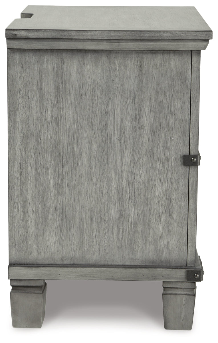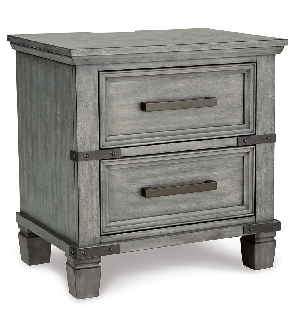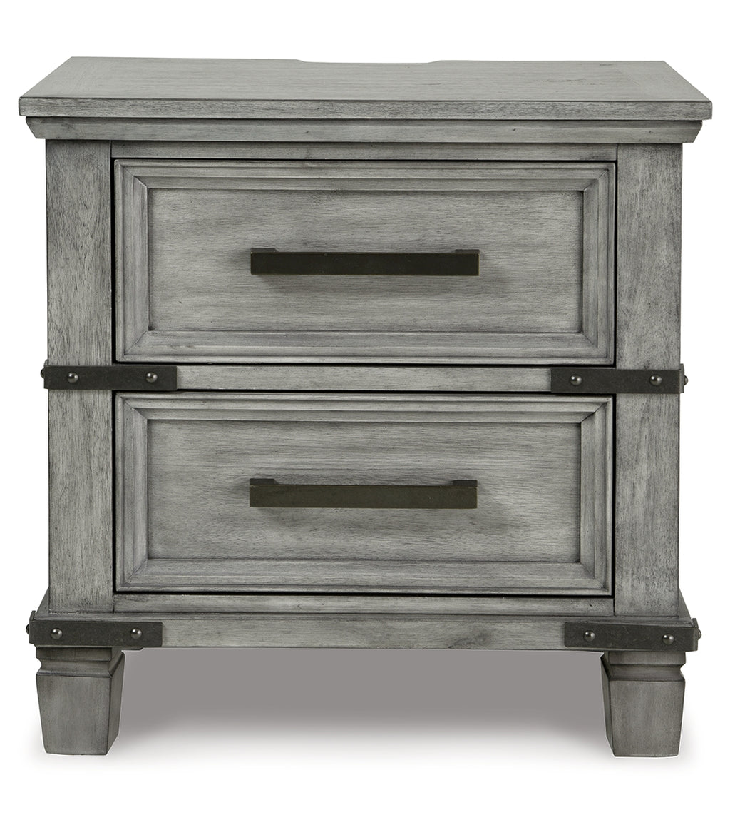 What's old is what's new with this nightstand. Serving up a fresh look in urban farmhouse style, this eclectic piece features a light weathered gray finish with dark aged bronze-tone bar pulls and metal straps for a casually cool sensibility. Profiled drawer frames, thick-profiled top moulding and tapered legs are the earmarks of timeless design. | Product Features