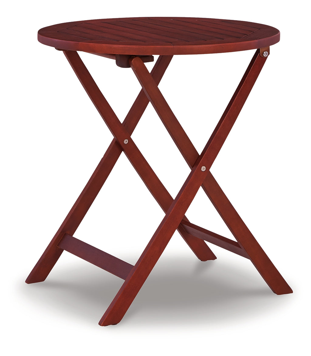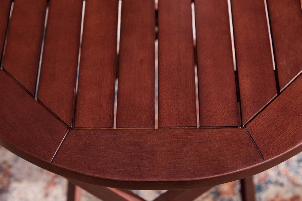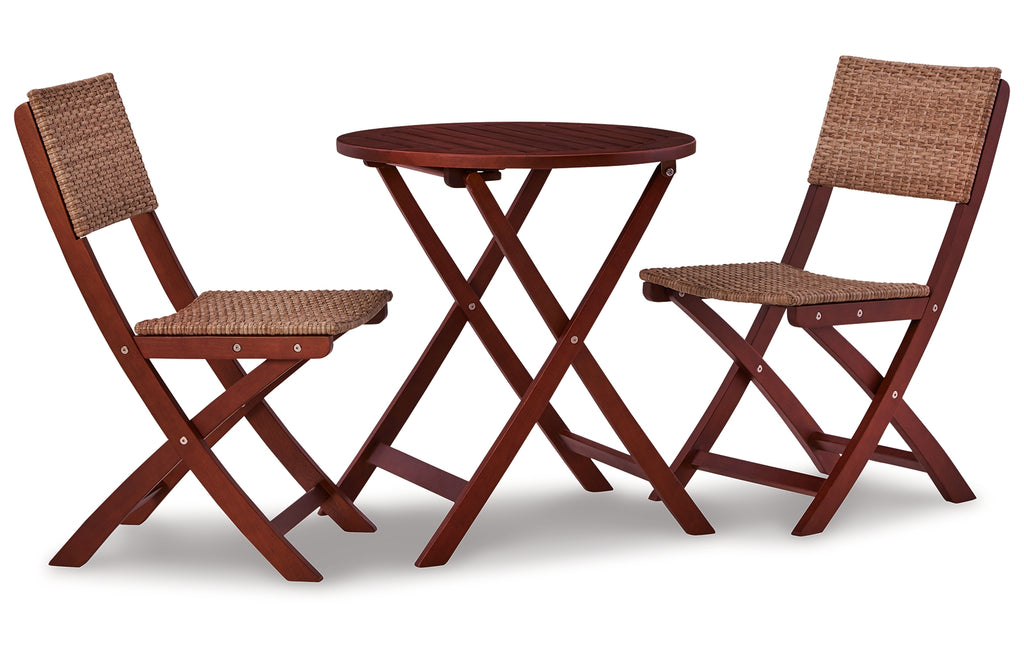 Whether breakfasting on your balcony or soaking up the sun poolside, this table and chair set brings a relaxed vibe to your outdoor decor. The frame's brown finish pairs with handwoven resin wicker, effortlessly suiting a variety of styles. The foldable design adds another layer of functionality. Crafted with a universal appeal, this set invites you to sit down and stay awhile. | Product Features