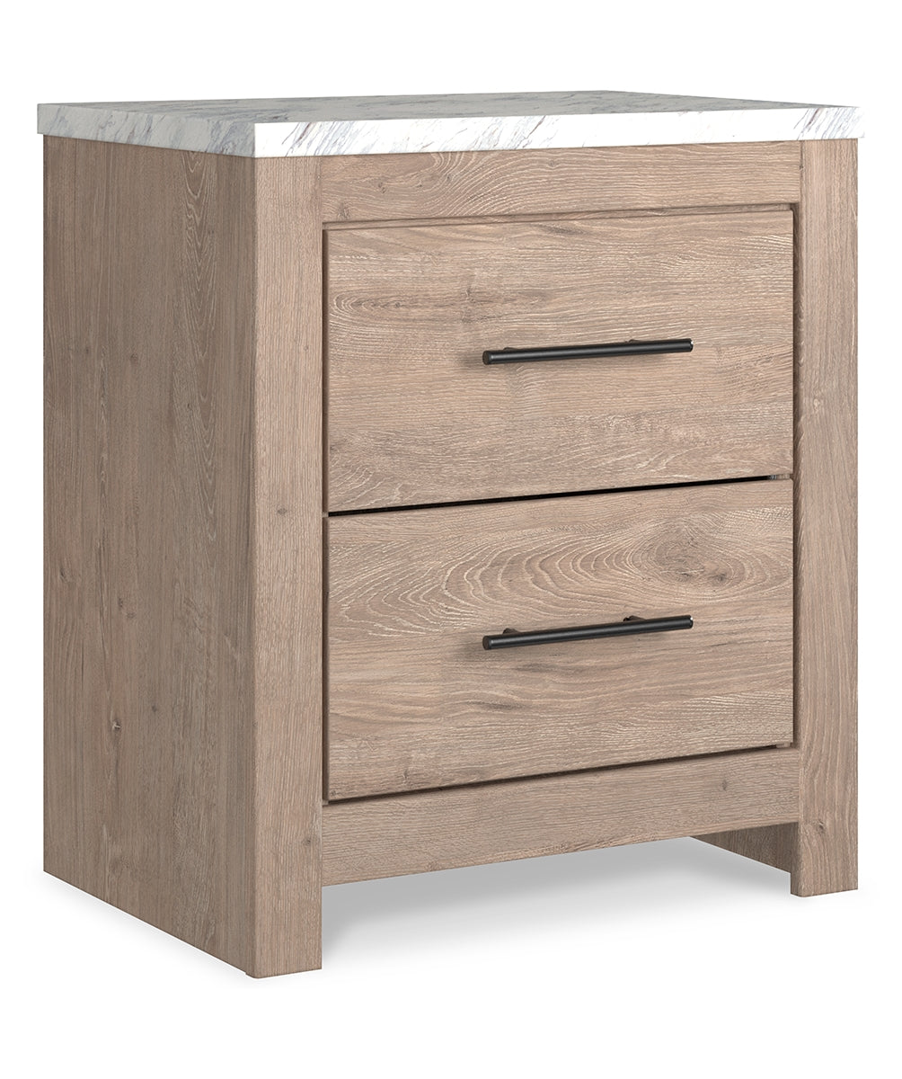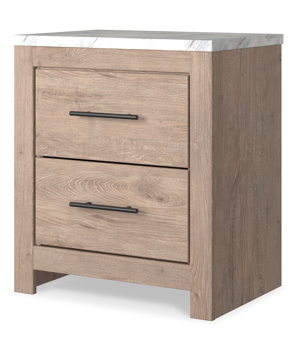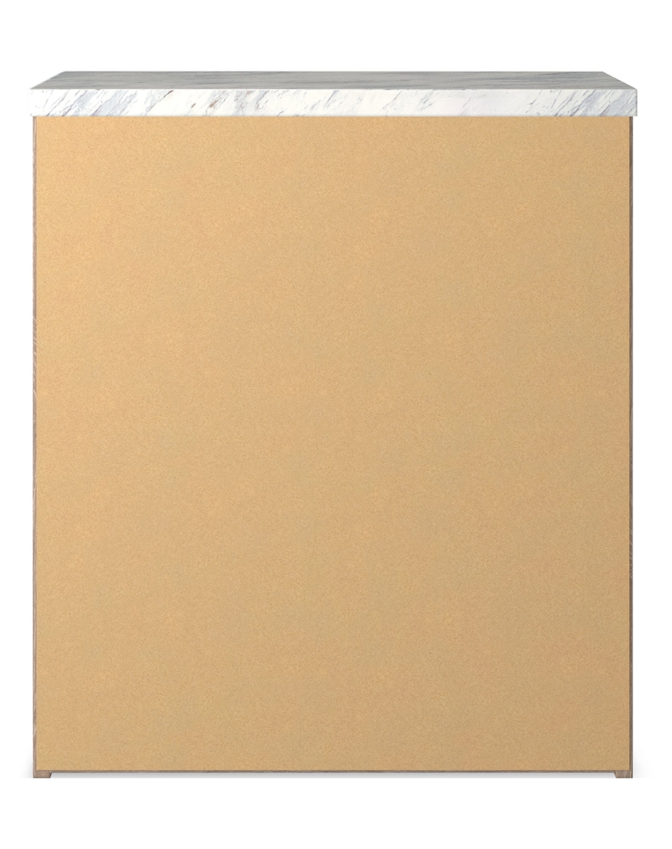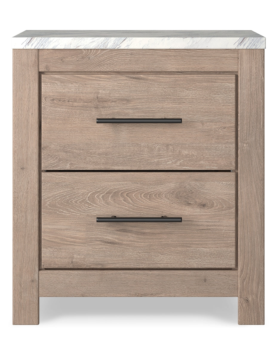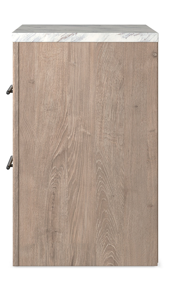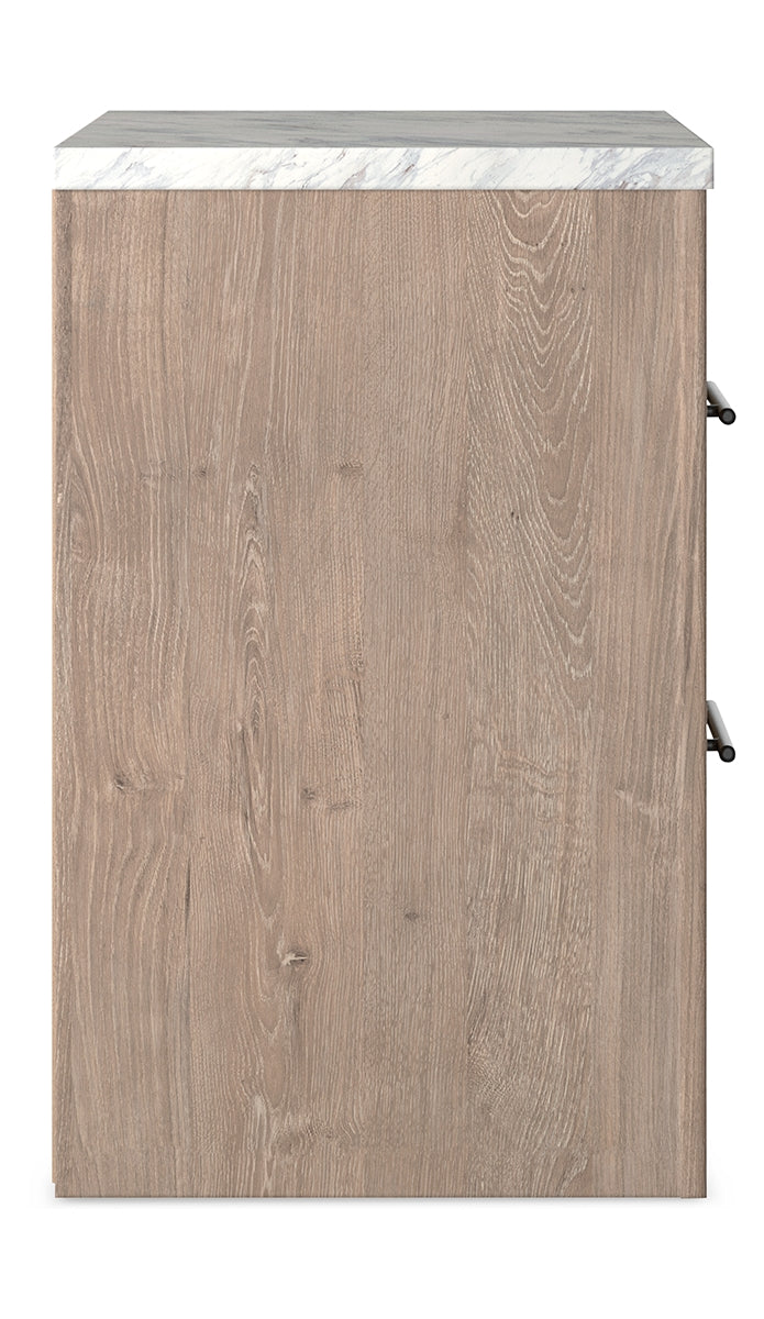 Cool, clean and casually modern. This nightstand’s light natural finish and faux Calcutta marble top set the tone for your calming sanctuary. Large linear pulls add dimension and authenticity. Two smooth-gliding drawers neatly accommodate your bedside needs. |