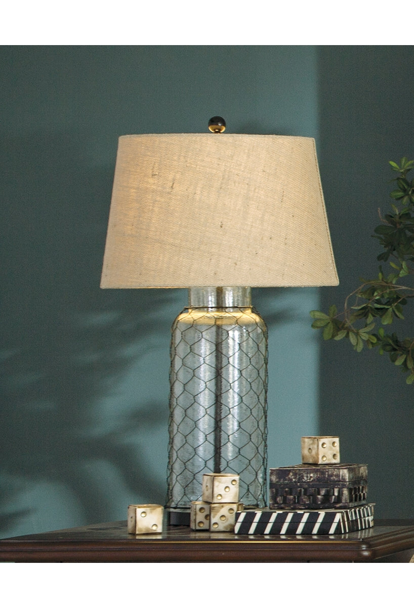 Wired and inspired. This designer table lamp’s transparent glass base is wrapped with woven wire for a fresh twist. A modified drum shade in a textural linen-weave fabric tops it off in naturally cool style. Whether your aesthetic is coastal chic, modern farmhouse or cottage quaint, you’re sure to delight in the warmth and beauty of this on-trend table lamp. |