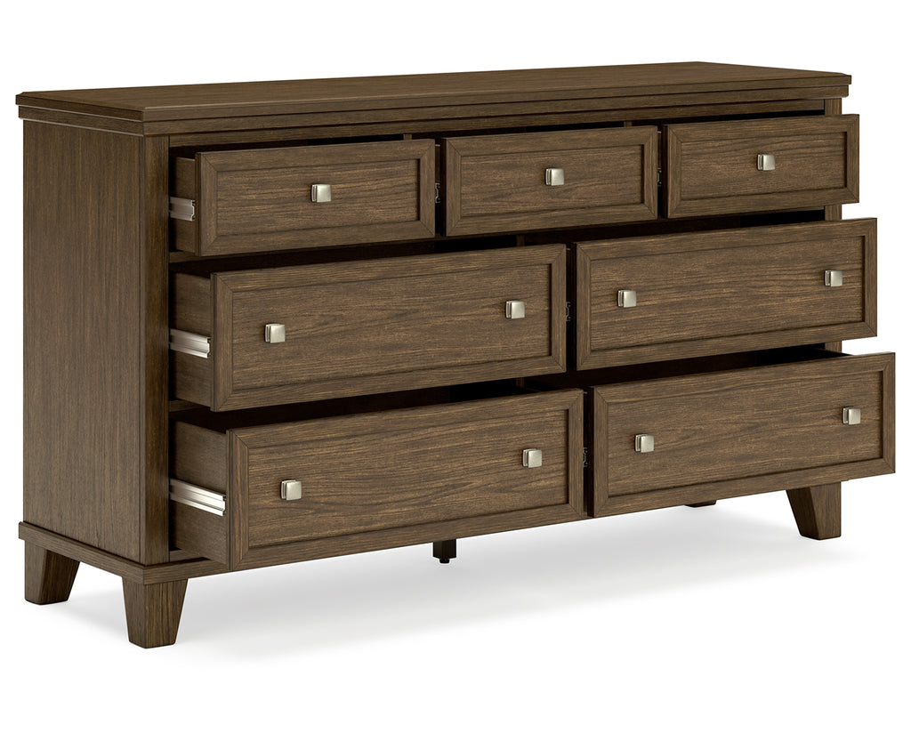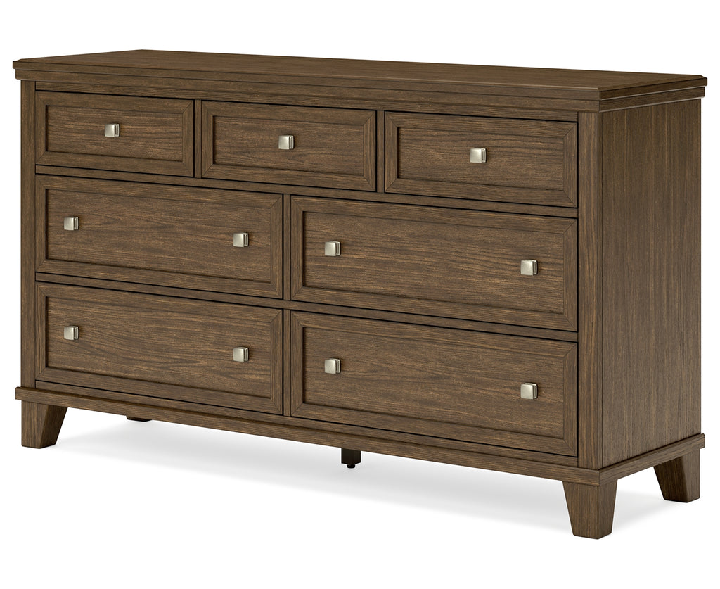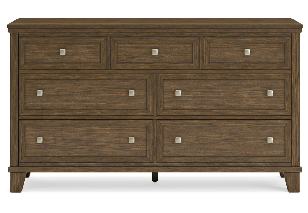This dresser is well-suited to everyday living with its expertly balanced approach to style and function. Take the stress out of decorating—a classic medium brown finish easily pairs with existing furniture pieces. And its timeless design stays in style as you update your space, so you can effortlessly enjoy the day-to-day comforts of home. | Product Features