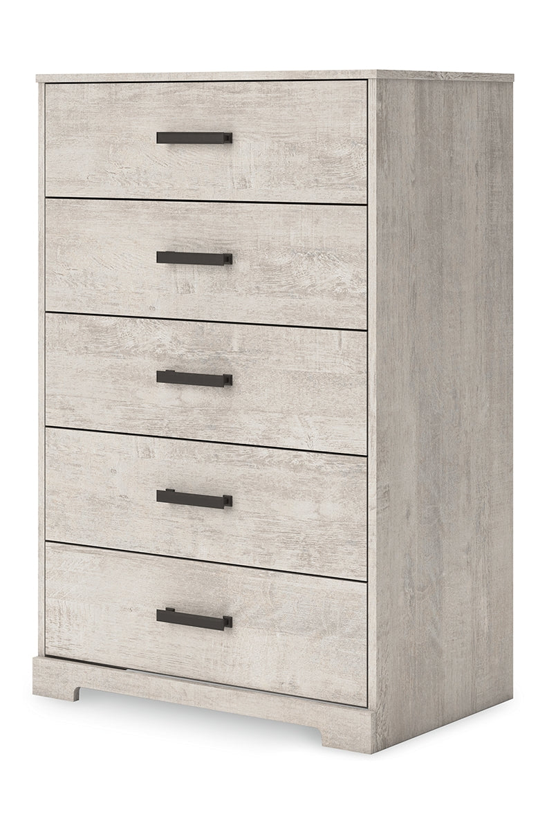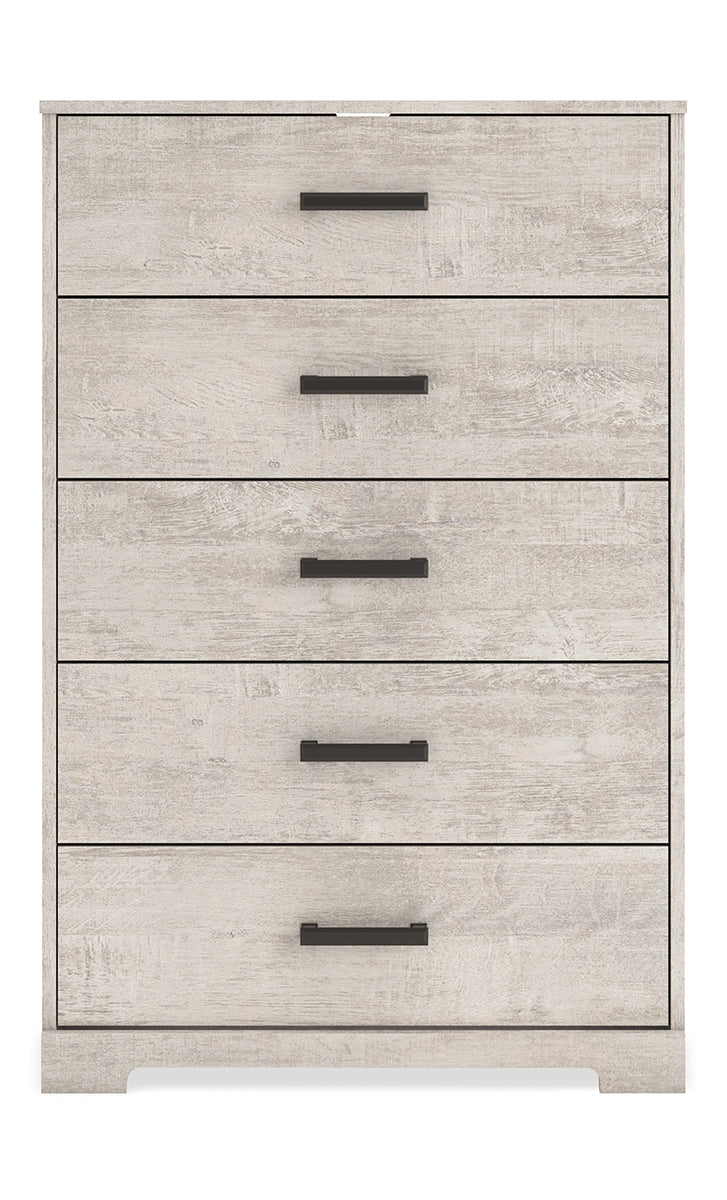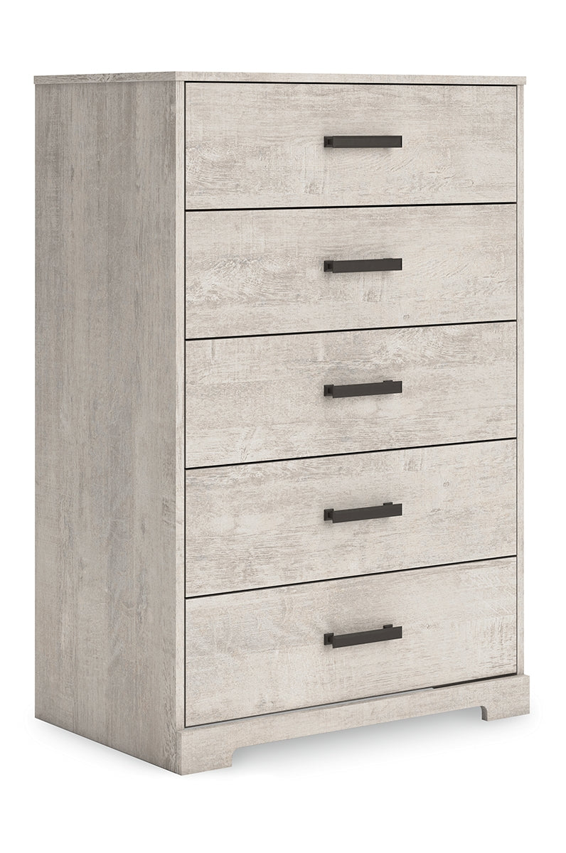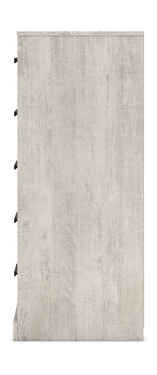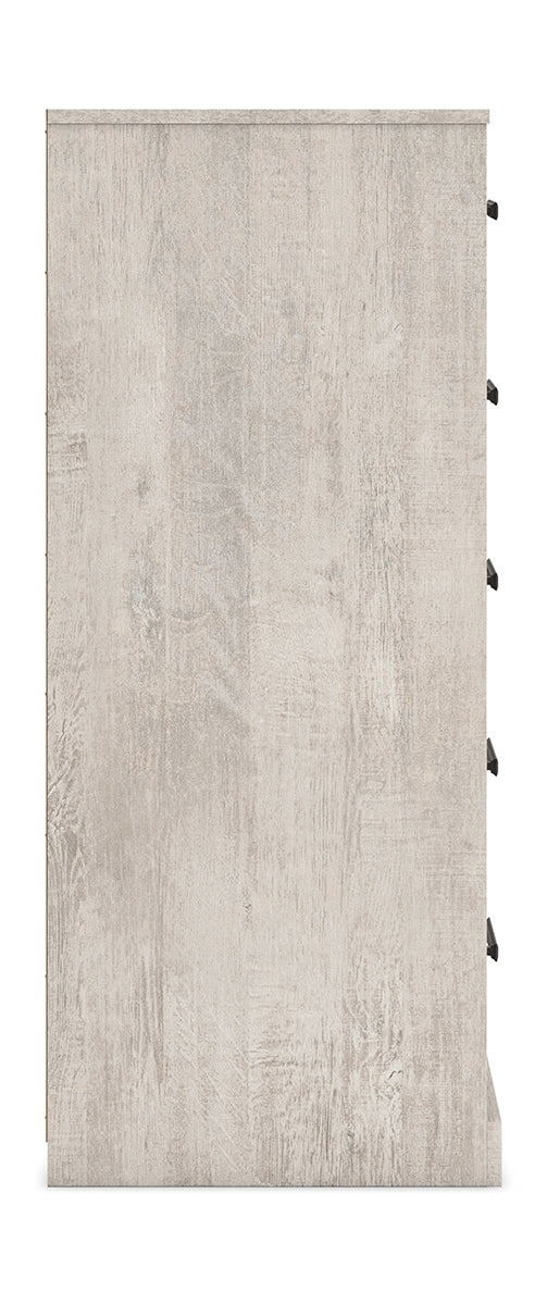 Give casual a new meaning with the chic look of the Shawburn chest of drawers. A light gray finish over replicated oak grain keeps it laid-back and inviting, while substantial pulls in a warm pewter tone add a modern farmhouse touch. Spacious drawers give you plenty of room to store your wardrobe. Talk about a delightfully relaxed vibe in your inner sanctum. | Product Features