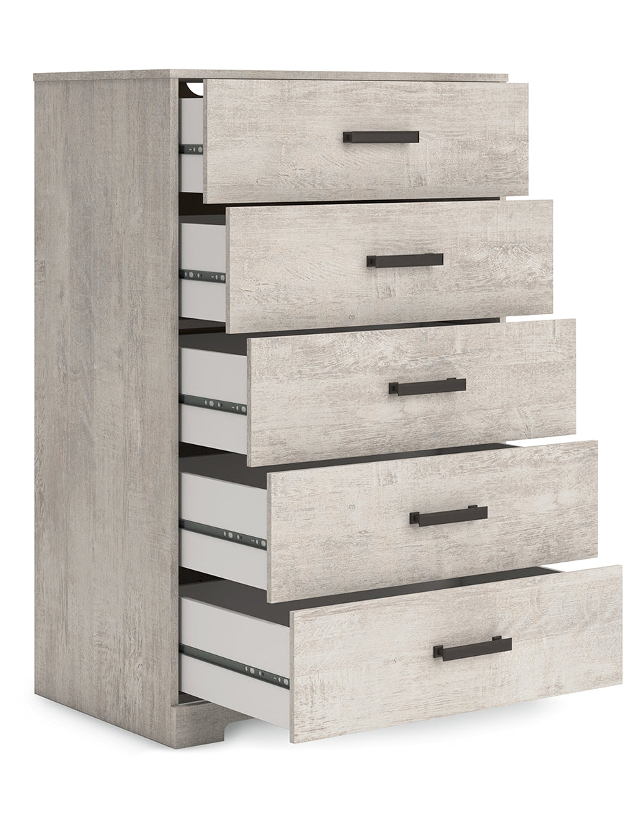 - 5 smooth-gliding drawers with vinyl-wrapped sides and back for durability