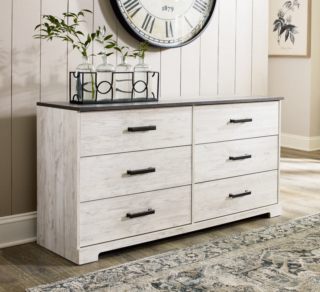 Give provincial a new meaning with the chic look of this dresser. A two-tone finish keeps this piece light and fresh, while the warm pewter-tone hardware adds an industrial touch. The dresser's distressed whitewashed body adds a delightfully homespun charm to your space. |