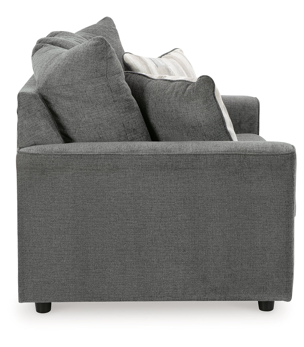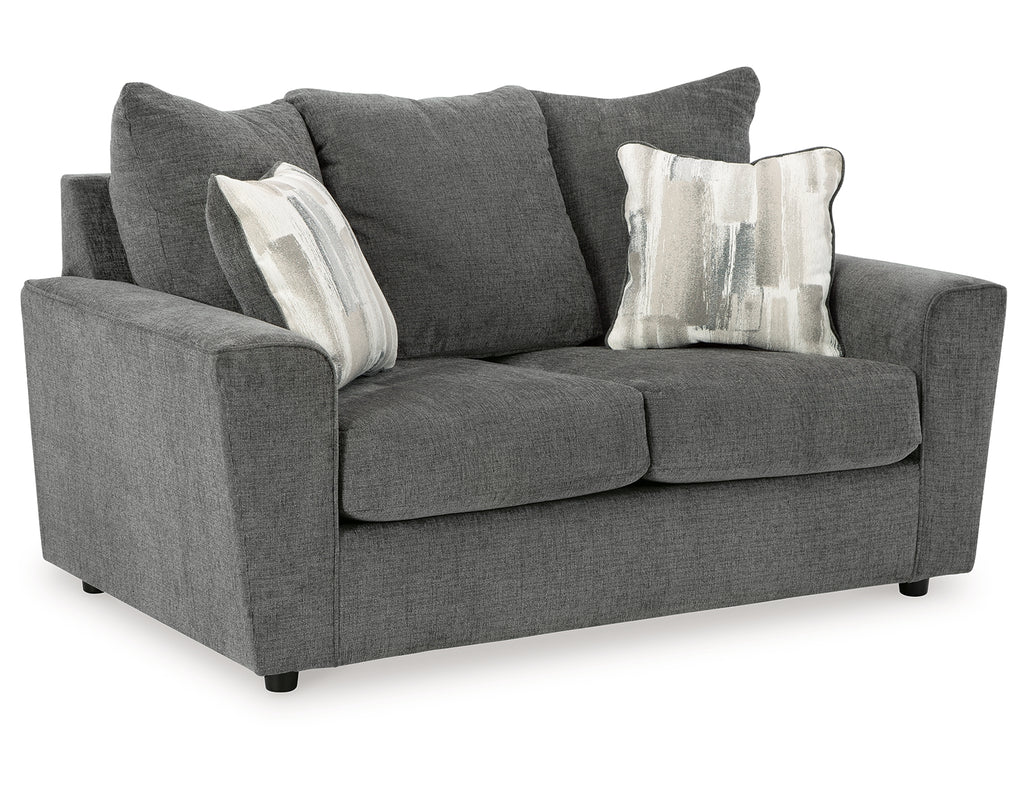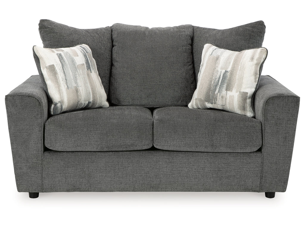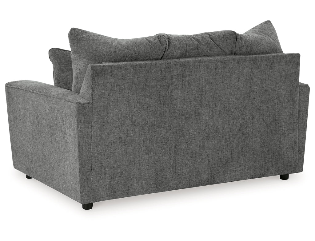 What’s new in neutrals? Shades of gray, of course. Embrace the sophisticated design trend with this gorgeous loveseat, which offers a clean-lined, contemporary style at a comfortably cool price. Sure to lift your spirits, the plush chenille fabric is fabulously neutral. Modern flared arms give it a distinctive flair. This loveseat also arrives with two cool brushstroke accent pillows to elevate the taste and comfort level. | Product Features