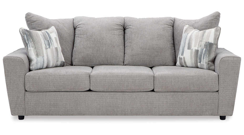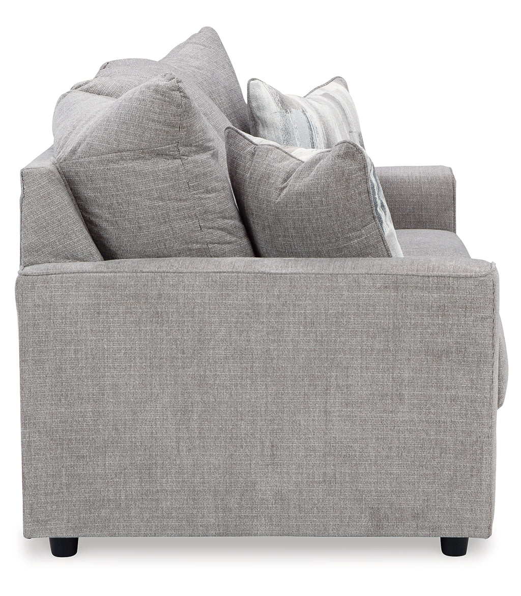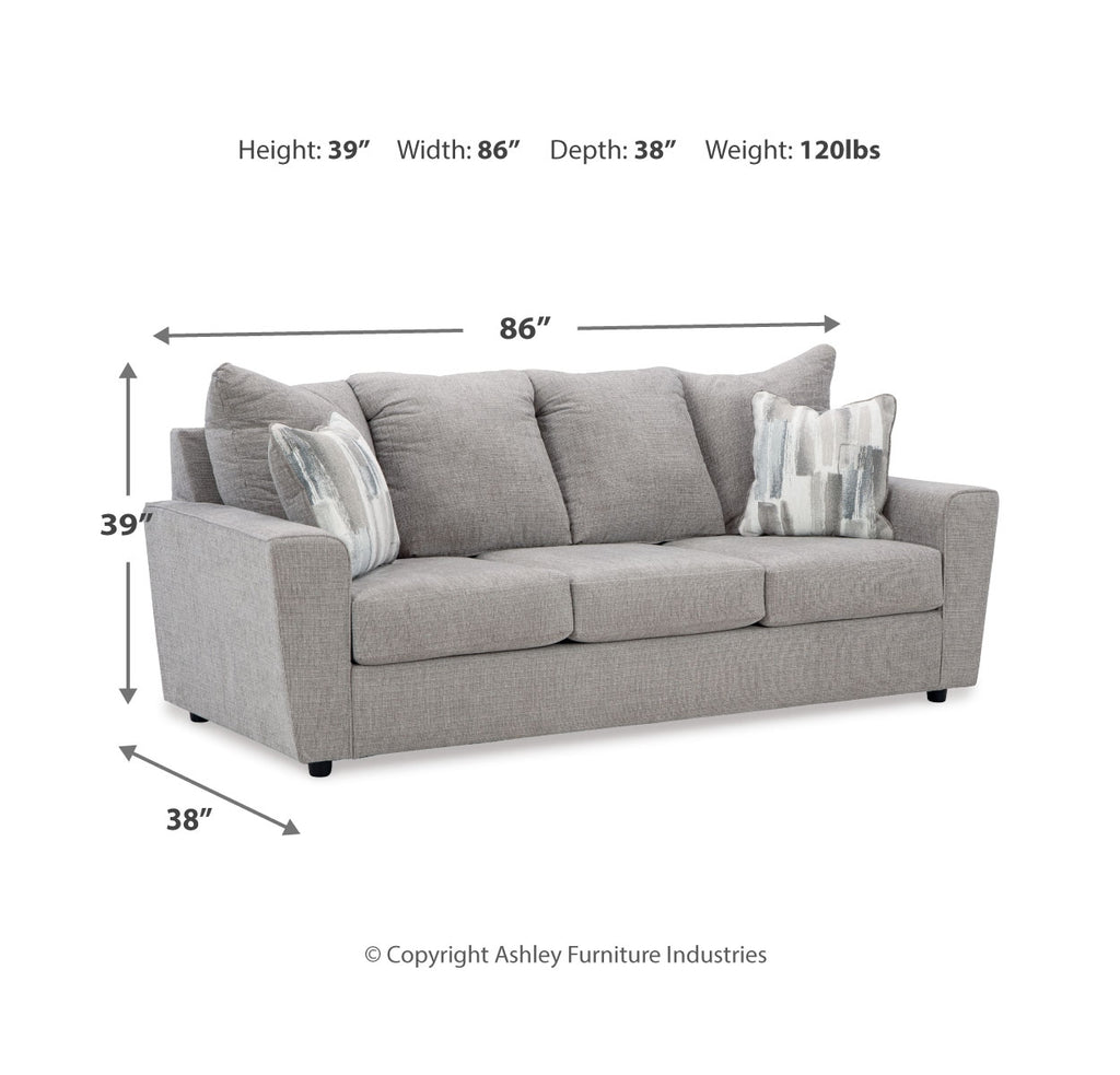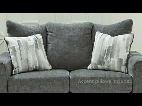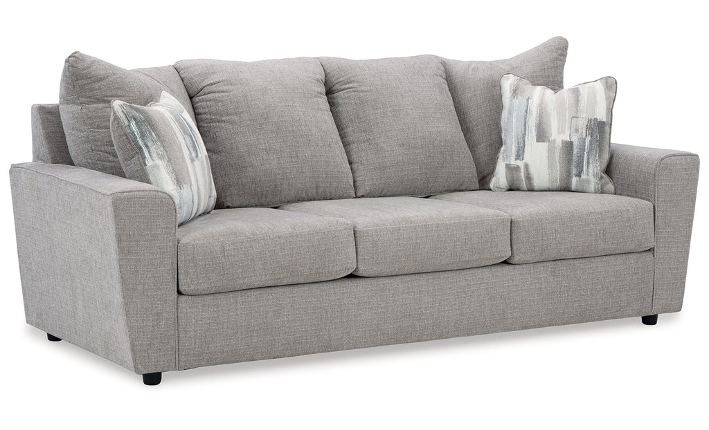 What’s new in neutrals? Shades of gray, of course. Embrace the sophisticated design trend with this gorgeous sofa, which offers a clean-lined, contemporary style at a comfortably cool price. Sure to lift your spirits, the plush chenille fabric is fabulously neutral. Modern flared arms give it a distinctive flair. This sofa also arrives with two cool brushstroke accent pillows to elevate the taste and comfort level.