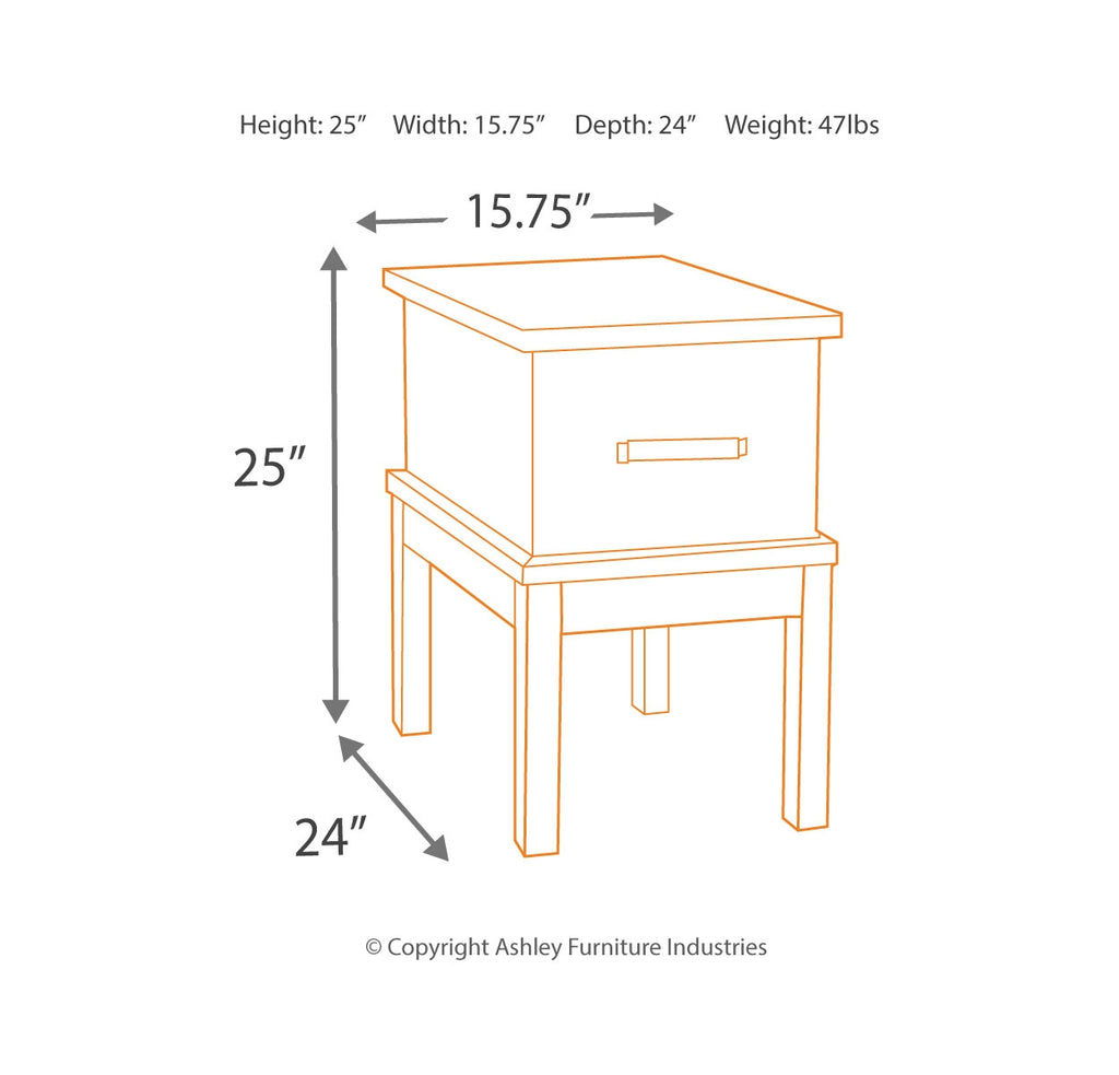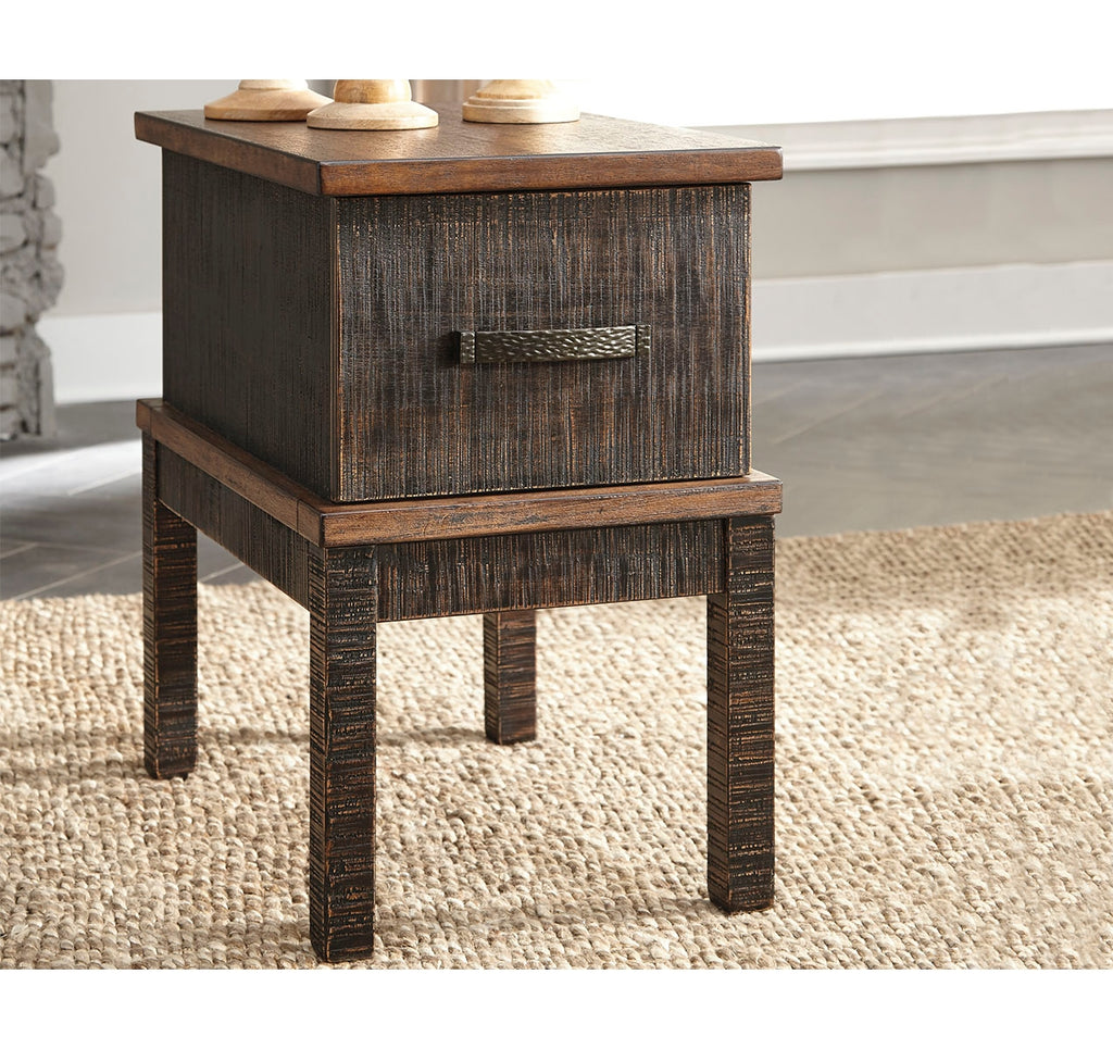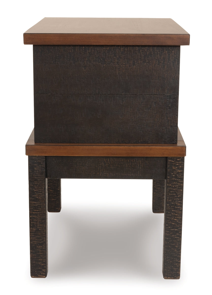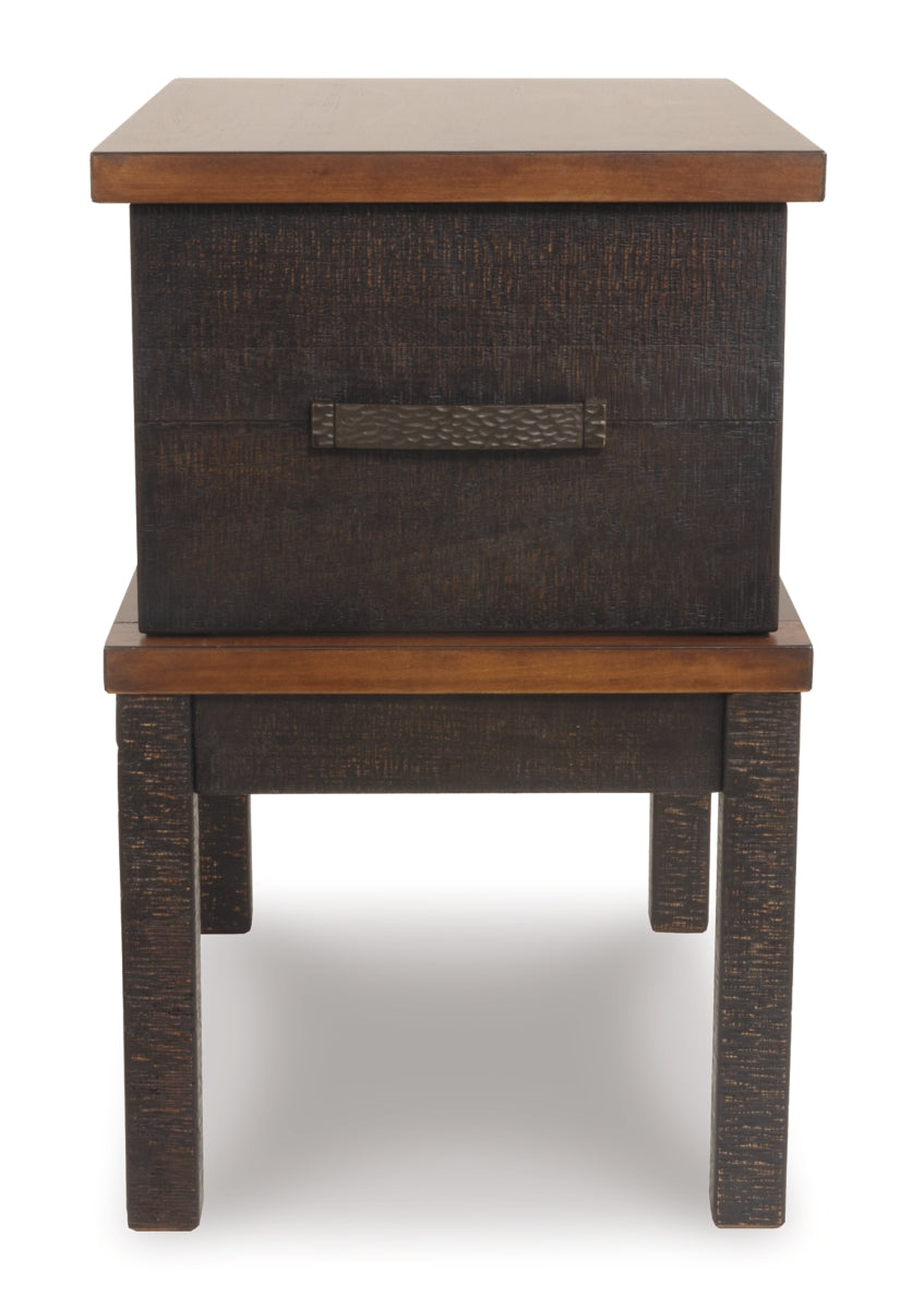 Earthy, rustic character. Clean, contemporary lines. The best of both stack up beautifully in this chairside end table. A simple, blocky profile is enriched with a two-tone finish with deep distressing for a decidedly different aesthetic. And with subtly placed power outlets/USB charging stations, it’s high design meets high tech. | Product Features